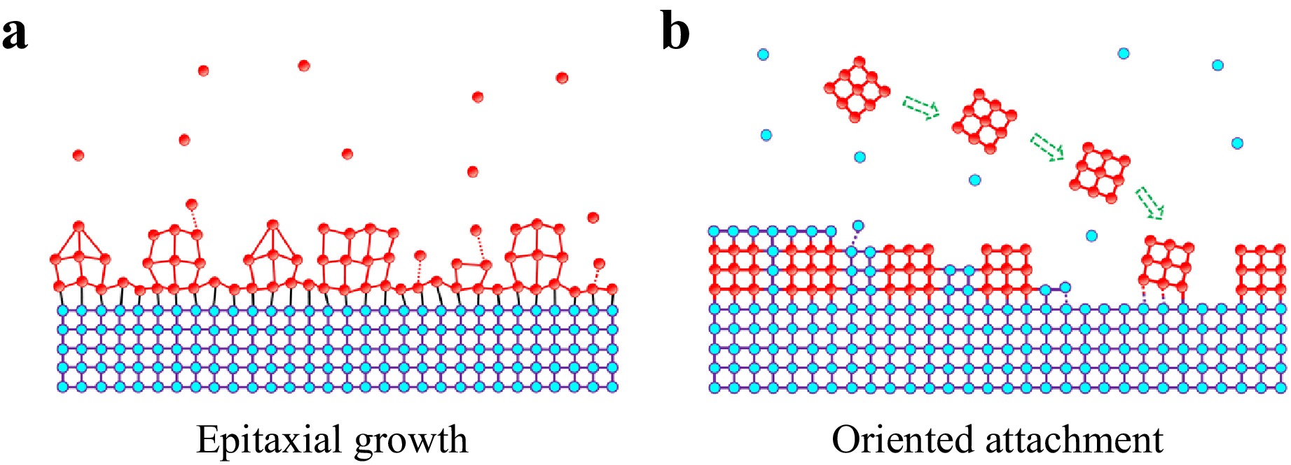 Fig. 1 Colloidal Quantum Dot-Oriented Attachment to Perovskite Single Crystal (CQD-OA-PSC) approach. a Schematical of conventional physical vacuum-based epitaxial growth, where growth takes place through atomic or molecular assembly driven by lattice-strain growth modes. b Schematic of Colloidal Quantum Dot-Oriented Attachment to Perovskite Single Crystal (CQD-OA-PSC) approach, which utilizes the precise control over quantum dot size, morphology, and structure provided by wet chemical colloidal synthesis methods, as well as the charge transport functionality imparted to the quantum dots by physical vacuum-based epitaxial growth on a matrix crystal.
