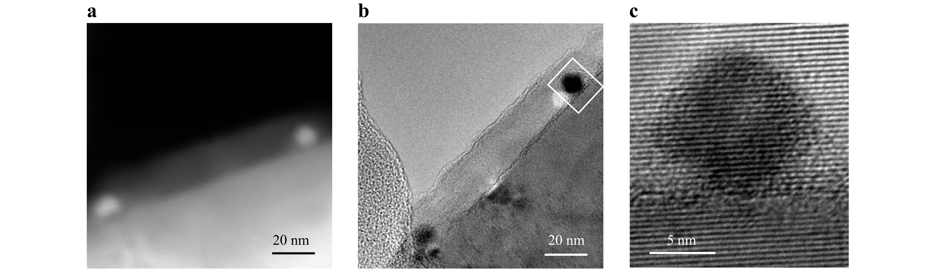 Fig. 2 Orientally attached quantum dots in ultra-thin epitaxially grown perovskite layer. a High-angle annular dark-field scanning transmission electron microscopy (HAADF-STEM) image of orientally attached PbS quantum dots in ultra-thin epitaxially grown CH3NH3PbBr3 perovskite layer, where the quantum dots are discernible as bright spots owing to their higher density. b Transmission electron microscopic (TEM) image of the same area shown in a. c High-resolution TEM image focusing on a single PbS quantum dot area, which shows that the quantum dot inherits the crystalline orientation of the CH3NH3PbBr3 perovskite substrate, sharing identical interplanar atomic spacing.