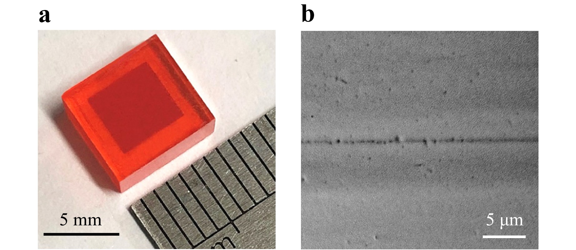 Fig. 3 Three-dimensional heterocrystal of quantum dots embedded in perovskite. a Macroscopic heterocrystal of PbS quantum dots embedded in CH3NH3PbBr3 perovskite. The quantum dots layer displays a darker inner square inside the perovskite crystal. b Cross-sectional SEM image of the three-dimensional heterocrystal. The dark line in the middle is the layer of quantum dots.