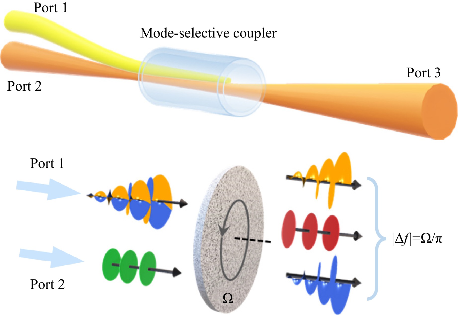 Fig. 1 Schematic view of all-fiber rotational Doppler velocimetry. Ω – angular velocity of rotating object; Δf – frequency shift of twisted light.