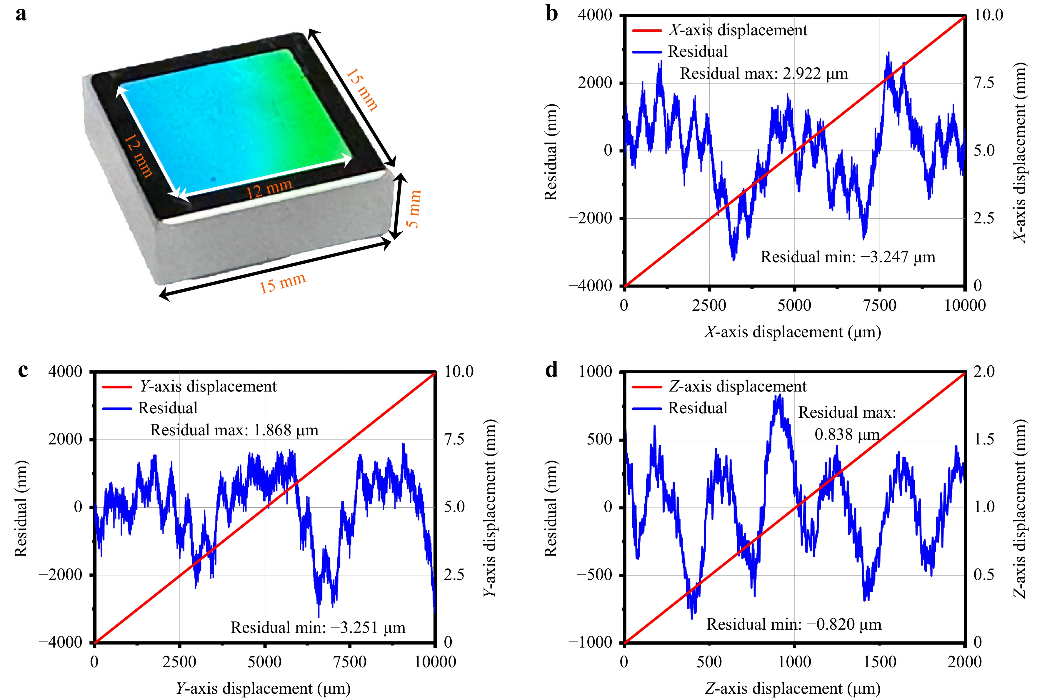 (5) Measurement range: The measurement range is a critical parameter of the measurement system, directly influencing its applicability in various scenarios. In this section, we use a 2D reflective grating with a period of 1000 nm as the measurement grating and the Newport HXP50-MECA as the displacement stage. As illustrated in Fig. 10a, the grating with dimensions of 15 × 15 × 5 mm3, is integral to the precise measurement of displacement along the XYZ axes. The system’s performance is validated by comparing experimental results with theoretical predictions, as shown in Fig. 10b-d. These figures show the displacement measurements along the X, Y, and Z axes, respectively, with the residuals indicating the difference between the measured and theoretical values. The measurement range of XYZ axes are 10 mm, 10 mm, and 2 mm, respectively. It is worth noting that the measurement range of the XY axis is primarily limited by the grating area. A larger grating area results in a larger measurement range, which could theoretically extend to the meter scale. Additionally, advanced methods for preparing large-area gratings have been proposed41, 42. In the X-axis test (Fig. 10b), the maximum residual is 2.922 µm, and the minimum residual is −3.247 µm. For the Y-axis (Fig. 10c), the maximum residual reaches 1.868 µm, and the minimum residual is −3.251 µm. Finally, in the Z-axis test (Fig. 10d), the residuals range from 0.838 µm (maximum) to −0.820 µm (minimum). These residuals reflect a combination of errors from the measurement system and the displacement table motion. Overall, these residuals highlight the high precision of the system, confirming its capability for accurate 3-DOF displacement measurements.