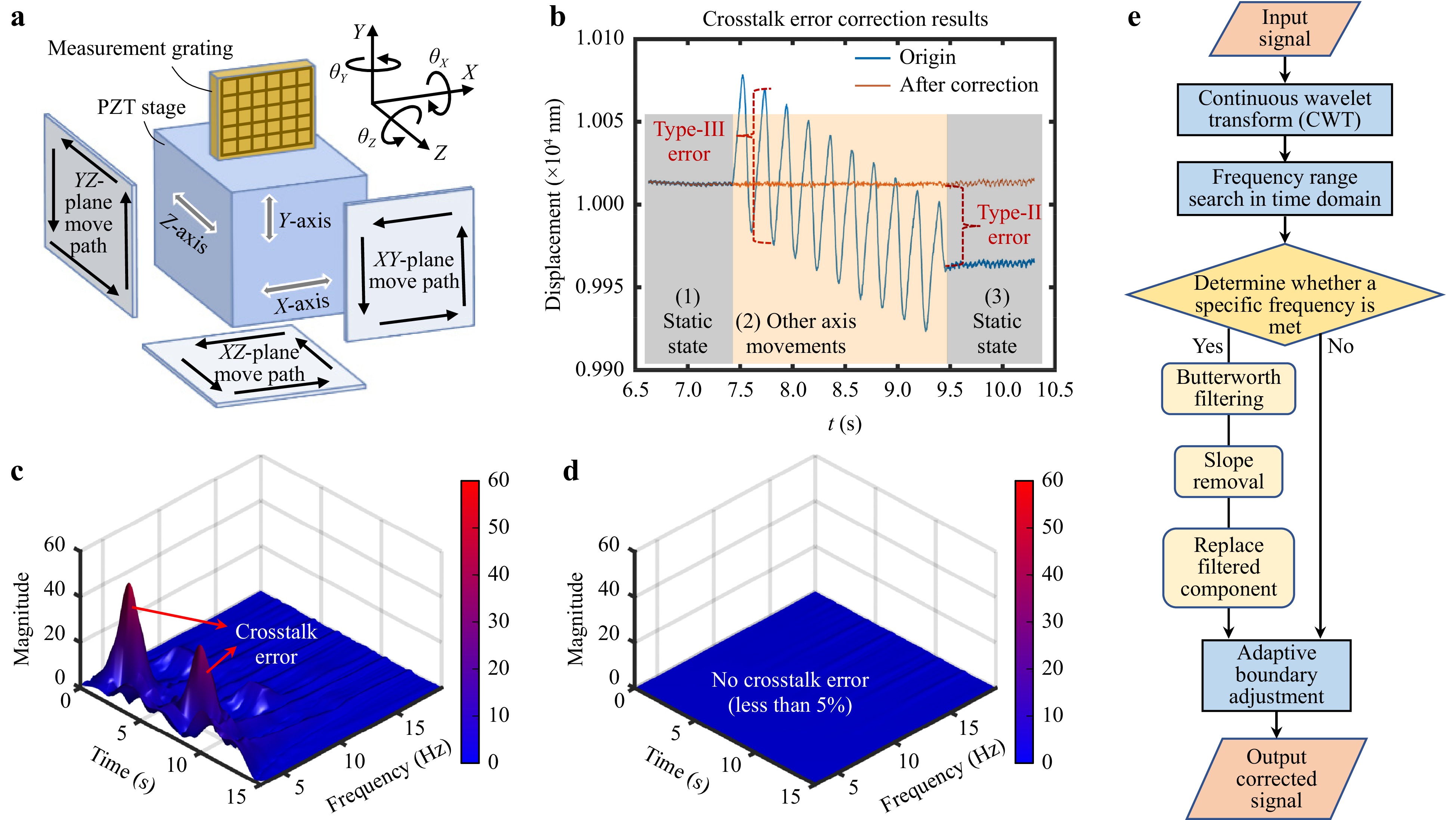 Fig. 11 Multi axes crosstalk error analysis and correction method. a Motion path of the grating in different planes. b In the XY plane, X-axis motion induces crosstalk error in the Y axis. c Wavelet transform diagram showing crosstalk error. d Wavelet transform diagram of crosstalk error after algorithm correction. e Flowchart of the correction algorithm.