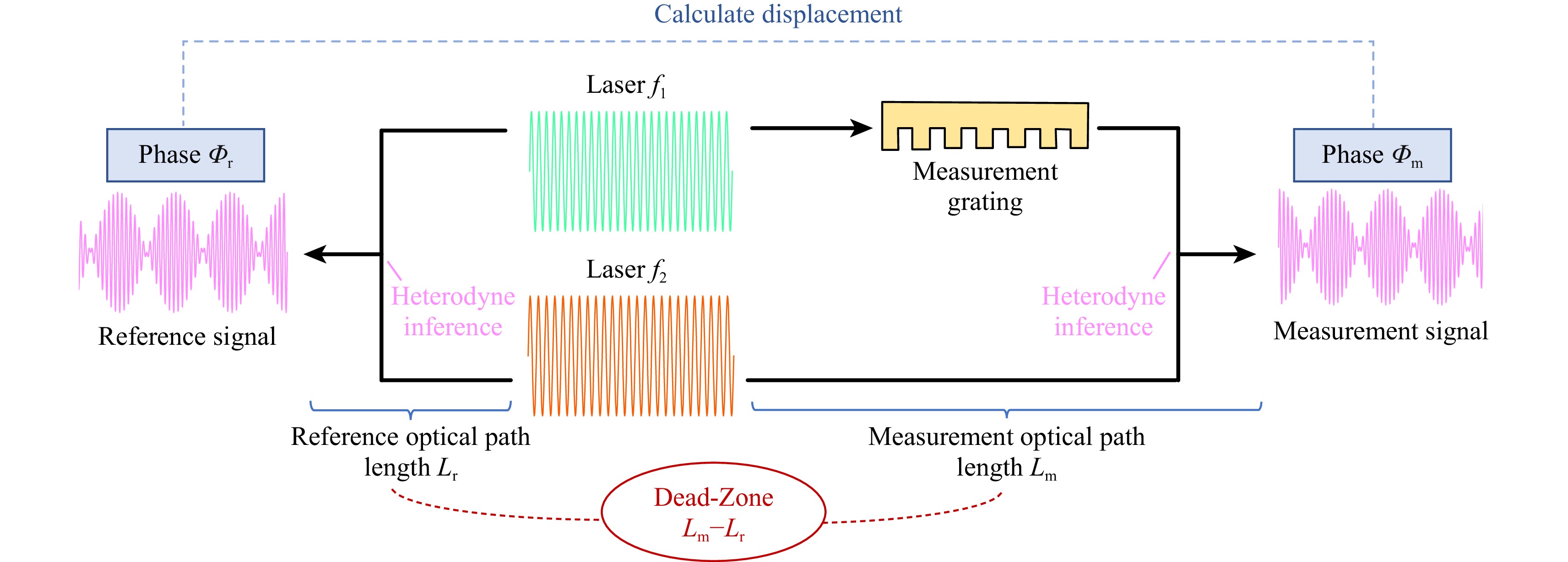 Fig. 2 schematically illustrates the concept of the dead zone, with certain optical components omitted for clarity. The optical configuration involves two laser beams with frequencies $ f_1 $ and $ f_2 $, propagating along distinct paths: (1) Measurement optical path: $ f_1 $ interacts with the measurement grating, which carries displacement information, and then combines with $ f_2 $ to produce a heterodyne interference signal, with its phase denoted as $ \Phi_m $). (2) Reference optical path: $ f_1 $ and $ f_2 $ are combined directly through optical components to generate a reference signal, with its phase denoted as $ \Phi_r $.