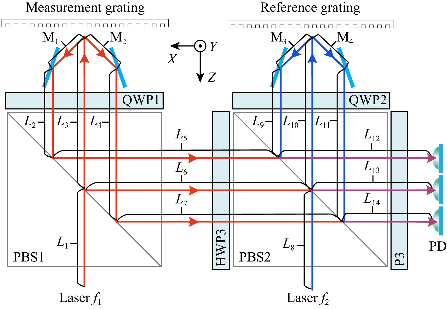 Next, we analyzed the polarization states of the beams. First, for laser $ f_1 $, after passing through HWP1 and P1, it becomes a p-polarized beam. It then passes through PBS1 and, after passing through QWP1, is converted into circularly polarized beam. The beam then undergoes reflection and diffraction at the diffraction grating. The five output beams are reflected back through QWP1, becoming s-polarized beam. Consequently, the beam is reflected at PBS1, passes through HWP3, where it is converted into p-polarized beam, and then transmitted through PBS2. After passing through P3, it is split into equal parts of p- and s-polarized beam. Next, we analyzed $ f_2 $. This beam follows a similar path, passing through HWP2, P2, PBS2, QWP2, the diffraction grating, QWP2 again, PBS2, and P3. After passing through P3, the beam is split into equal parts of p- and s-polarized beam, which then interfere with the corresponding components of laser $ f_1 $ to form interference signals (0, $X_{+1}$, $X_{-1}$, $Y_{+1}$, and $Y_{-1}$).