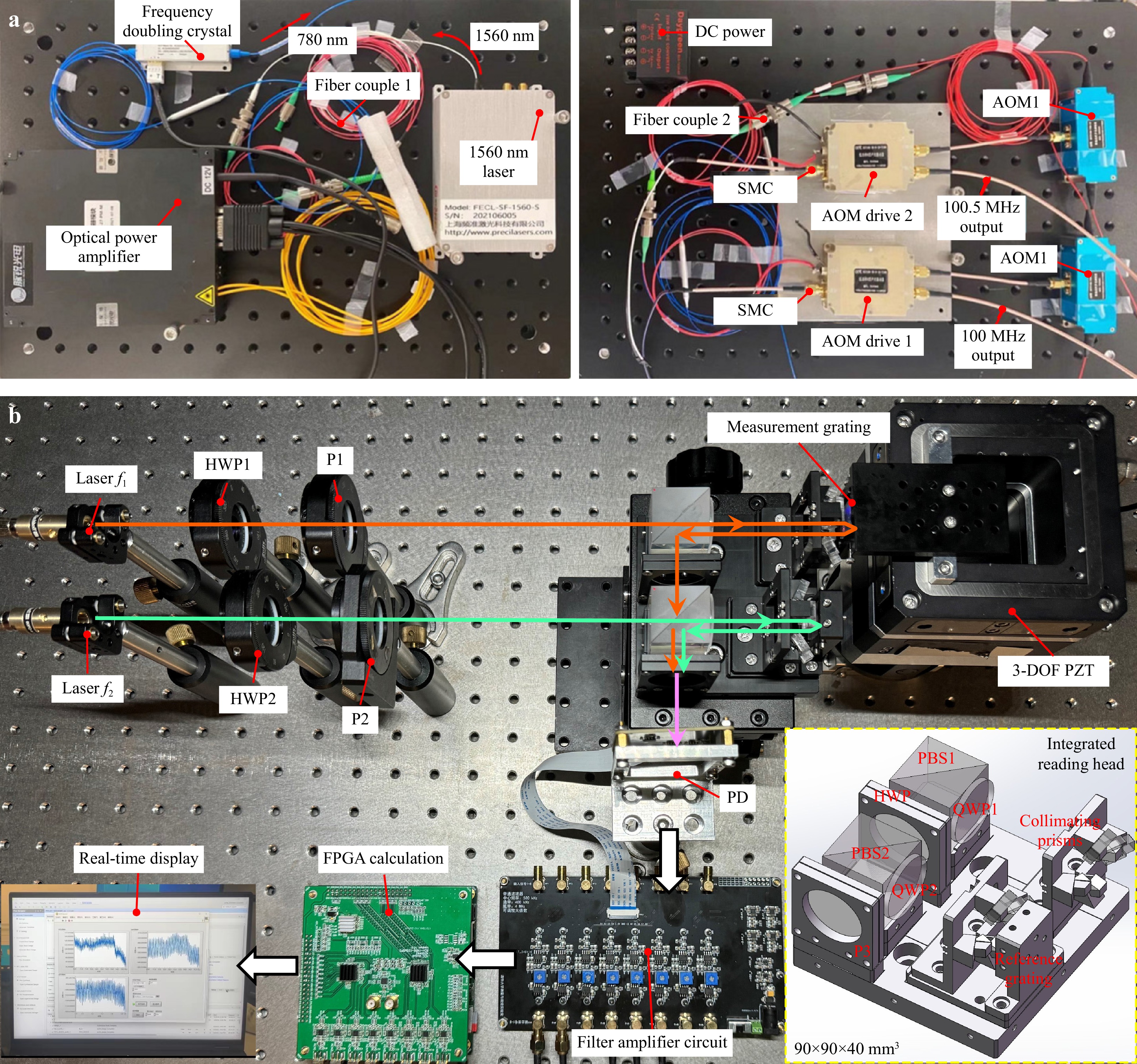 Fig. 4 Prototype of the grating interferometer system for 3D measurement. (a) Heterodyne dual-frequency laser source. (b) Measurement system, comprising the laser power control module (HWP and P), Integrated reading head, 2D measurement grating, 3-DOF Piezoelectric Stage (PZT), and a real-time processing and display module (PD, filter amplifier circuit, FPGA calculation and real-time display module).