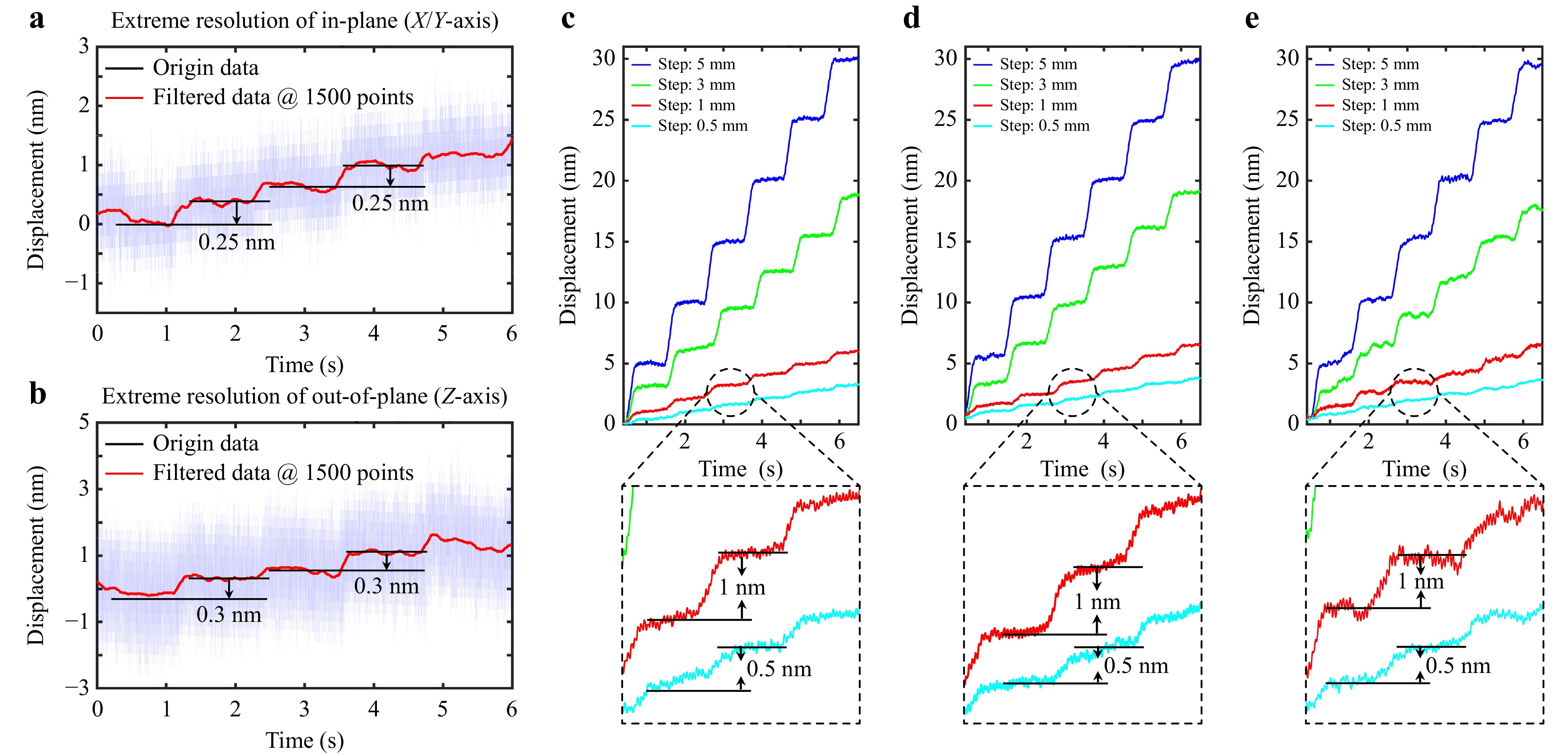 Besides, Fig. 5c-e presents multi-level resolution tests for the XYZ axes, incorporating step sizes of 0.5, 1, 3, and 5 nm. In summary, the above experiments demonstrate that the system can resolve displacements at a near-atomic level (0.25 to 0.3 nm) and exhibits high universality across a wide range of displacement step sizes.