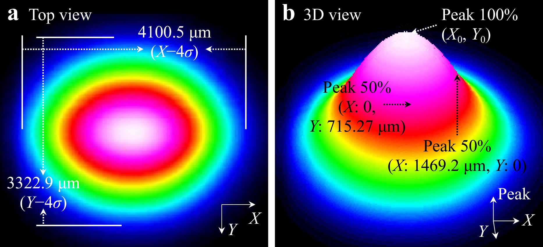 To assess the performance of the laser source, we used a beam profiler to analyze the laser, as shown in Fig. 6. As shown in Fig. 6a, the laser beam exhibits an elliptical intensity distribution, with widths of 4100.5 µm (X-4$ \sigma $) and 3322.9 µm (Y-4$ \sigma $). Fig. 6b shows that the maximum intensity peak is located at (0, 0) with a value of 100%, the 50% intensity points are at (0, 715.27 µm) and (1469.2 µm, 0). The energy center stability of the beam is controlled at (3.36 µm, 1.80 µm). In summary, the beam cross-section of the laser source exhibits an elliptical Gaussian distribution and demonstrates high stability, making it suitable for high-precision measurement.