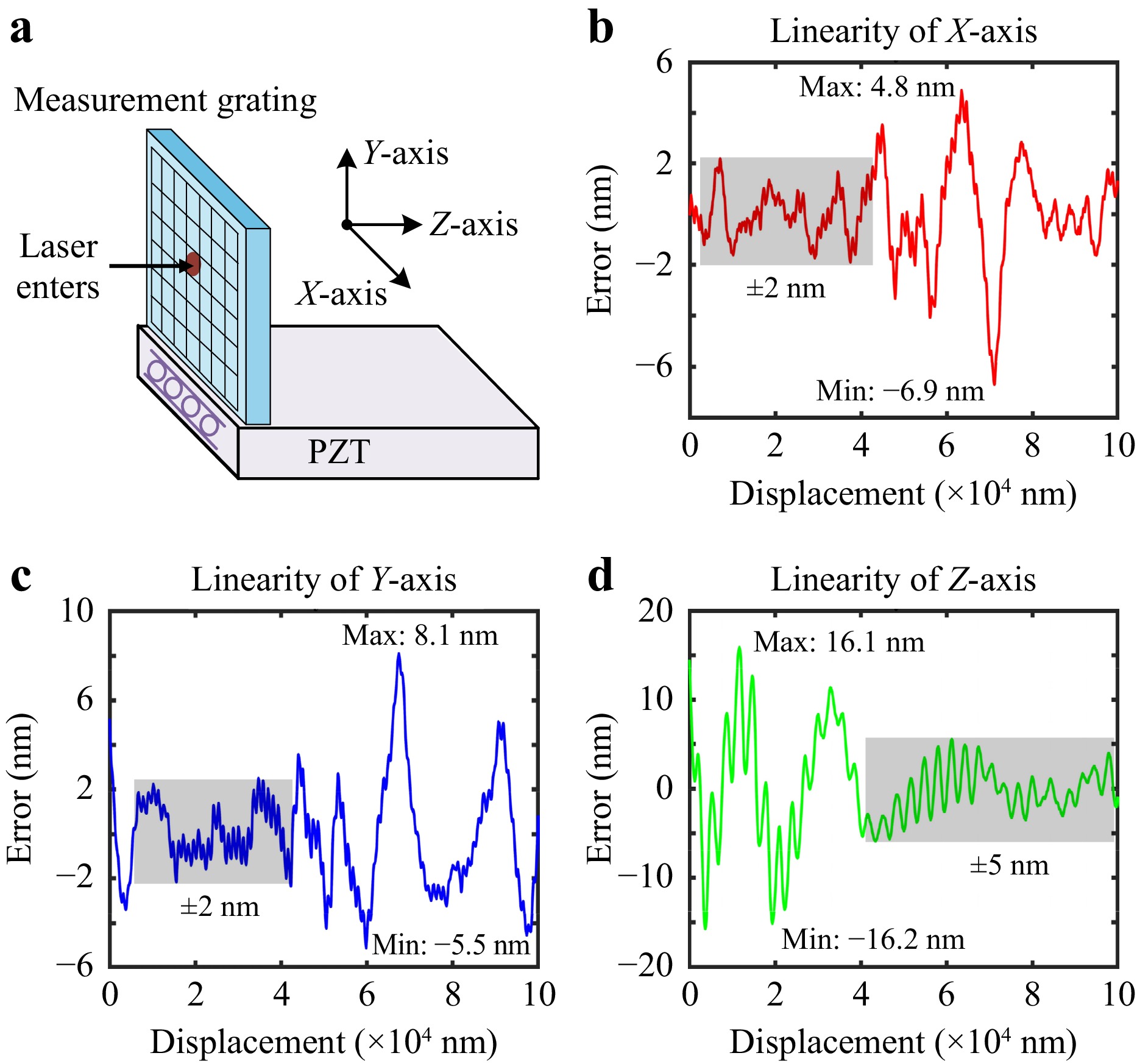 (2) Linearity: Linearity represents the error level of the measurement system across a defined measurement range. In Fig. 7, linearity tests were carried out for each axis. The calculation method involves subtracting the internal output value of the 3-DOF PZT (which was professionally calibrated to sub-nanometer precision and can be regarded as the “ground truth”) from the corresponding output value of the measurement system. Fig. 7a represents the directions of different axes, and the measurement range of each axis is 100 µm (this is the maximum stroke of 3-DOF PZT). For the linearity of the X-axis, as shown in Fig. 7b, the maximum and minimum errors observed are 4.8 nm and -6.9 nm, respectively. The error level during the stationary phase is 2 nm. For the linearity of the Y-axis, as shown in Fig. 7c, the maximum and minimum errors observed are 8.1 nm and -5.5 nm, respectively. The error level during the stationary phase is also 2 nm. For the linearity of Z-axis, as illustrated in Fig. 7d, the maximum and minimum errors are 16.1 nm and -16.2 nm, respectively. The error level during the stationary phase is 5 nm. Thus, the linearity of the XYZ-axis is calculated to be 6.9e-5@100 µm, 8.1e-5@100 µm, and 16.2e-5@100 µm, respectively. In the stationary phase, the linearity of the XYZ-axis can be improved to 2e-5@100 µm, 2e-5@100 µm, and 5e-5@100 µm, respectively. These results confirm the system’s high measurement precision, with the observed maximum deviations reflecting its non-linear characteristics.
