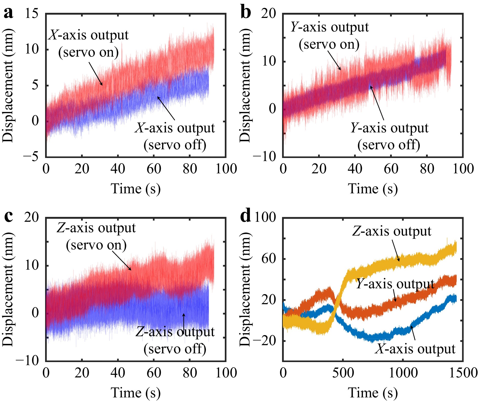 (3) Stability: Stability represents the ability of the system to maintain consistent operation, which is also influenced by environmental factors. Fig. 8 illustrates the stability test, where the servo on refers to the open-loop control of the 3-DOF displacement stage (P-733.2CD for the XZ-axis and P-733.Z for the Y-axis), and servo off refers to the closed-loop control. The Fig. 8a shows the X-axis output displaying distinct behavior under two conditions: with the servo on (red) and off (blue). The error steadily increases over time, with the servo on resulting in a maximum error of approximately 13 nm, while the servo off exhibits a lower volatility with an error around 8 nm. Similarly, as shown in Fig. 8b, the Y-axis with servo-off provides a smooth displacement curve, reaching around 12 nm. As shown in Fig. 8c, the Z-axis output further supports these observations. With the servo on, the maximum error reaches 15 nm, exhibiting a more consistent trend, while with the servo off, the maximum error reduces to 5 nm. Finally, as shown in Fig. 8d, the outputs from all three axes are plotted over a longer time (1400 s). The Z-axis (yellow) output shows significant fluctuations, reaching a displacement of approximately 80 nm. In contrast, the X-axis (blue) and Y-axis (red) outputs remain more stable, highlighting the varying levels of stability across the axes under servo control. In general, the XYZ-axis of the system can maintain the stability of 20 nm@1000 s, 20 nm@1000 s, and 60 nm@1000 s, respectively, at 1000 s. This demonstrates that the measurement system can sustain nm-level stability over extended periods of operation.