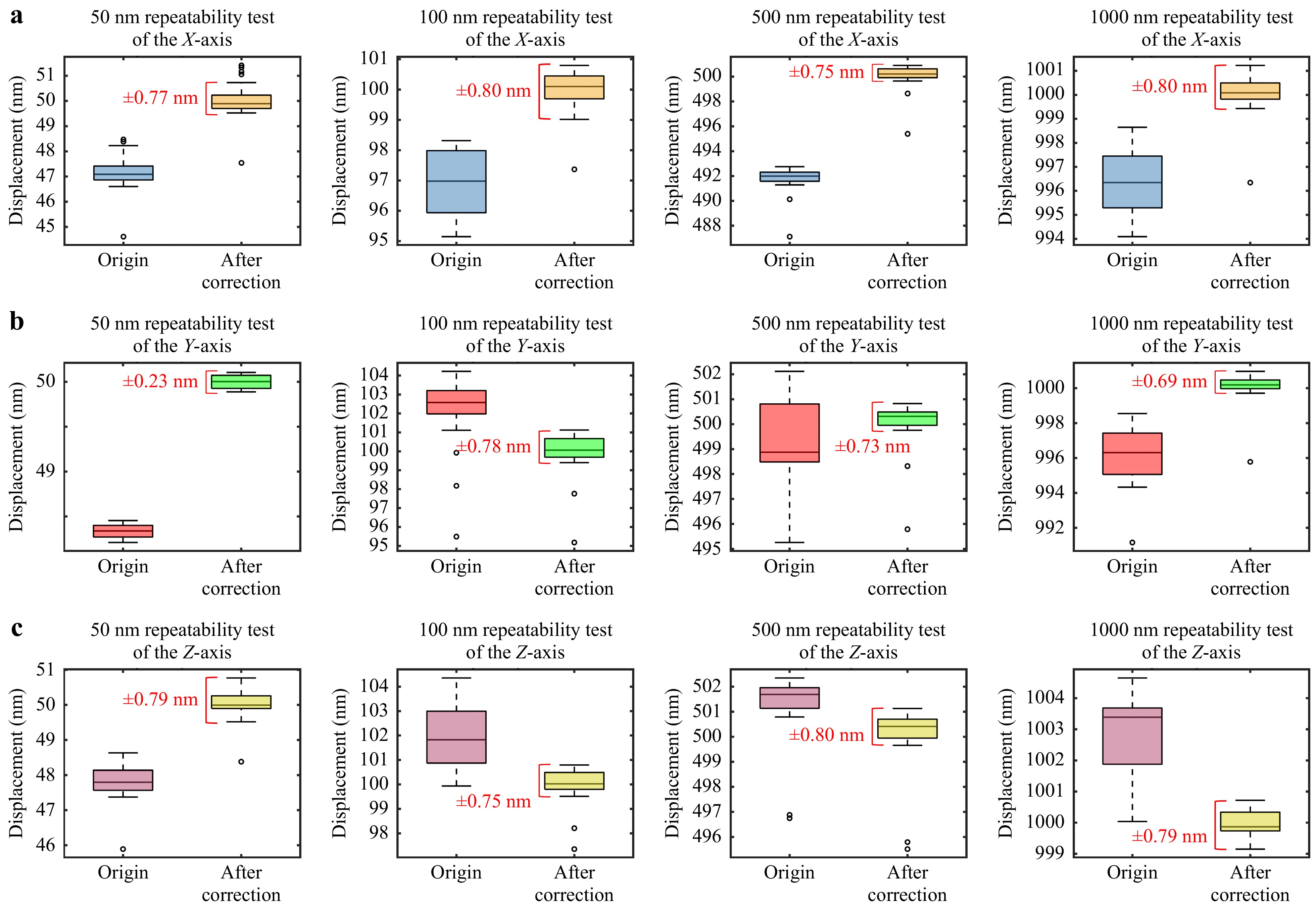 (4) Repeatability: Repeatability refers to the consistency of measurement results in repeated tests under the same conditions. In this section, a large number of tests and evaluations were conducted for the XYZ axes. As shown in Fig. 9, box plots are used to statistically quantify the dispersion of 50 repeated tests with step displacements of 50 nm, 100 nm, 500 nm, and 1000 nm (speed: 1000 nm/s). Box plots display the median, interquartile range (IQR), and outliers, making them effective for assessing measurement stability under random noise.