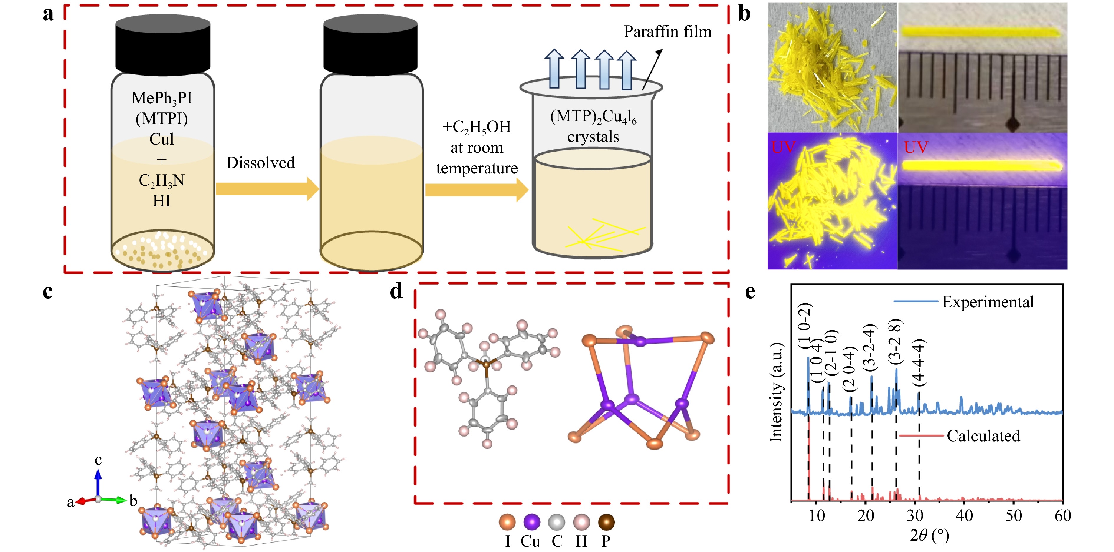 Fig. 1 a Schematic of the (MTP)2Cu4I6 crystal growth process. b Photograph of (MTP)2Cu4I6 crystals under natural light and 365 nm ultraviolet irradiation. c Crystal structure of (MTP)2Cu4I6. d Molecular structure of the MTP+ cation and configuration of the [Cu4I6]2− anion with normal thermal ellipsoids. e Experimental and theoretically calculated X-ray diffraction (XRD) patterns of (MTP)2Cu4I6.