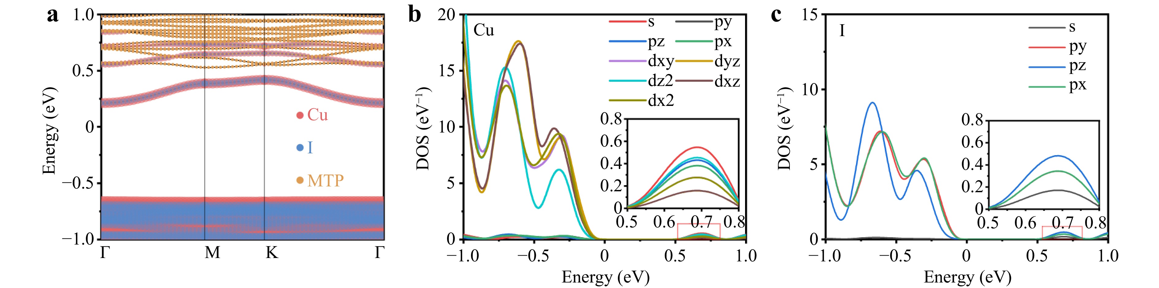 Fig. 2 a Calculated band structure of (MTP)2Cu4I6. b Density of states (DOS) of Cu element. c DOS of I element.