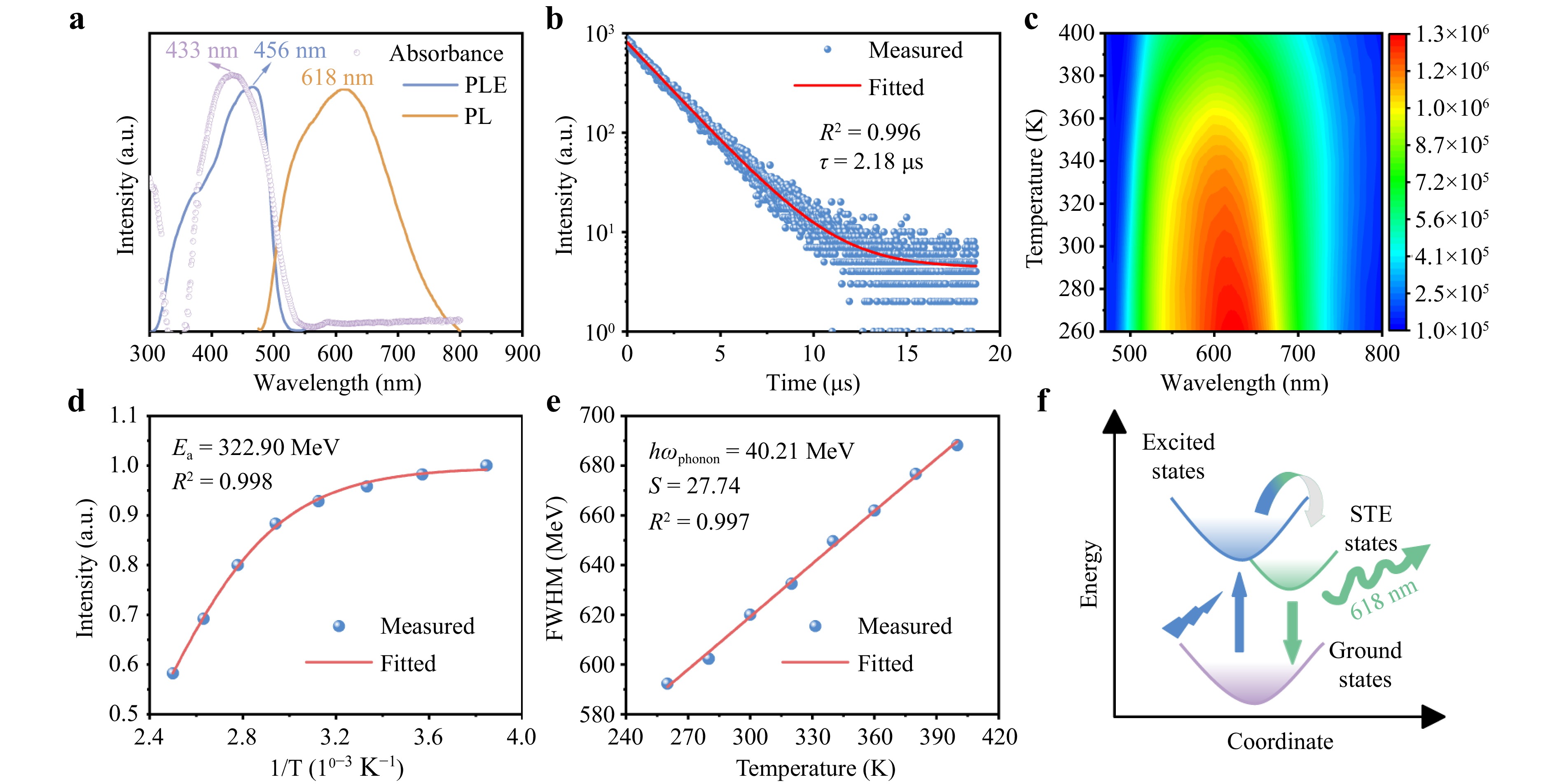 A configuration coordinate diagram was used to depict accurately STE formation and emission dynamics. As indicated by the vertical upward blue arrow, the ground state electrons transition to the excited state upon photoexcitation to form free carriers, which subsequently form free excitons with the release of exciton binding energy. During the formation of STEs, excited excitons and phonons undergo coupling interactions, internal conversion, and relaxation processes, which lead to lattice deformation and energy reduction. The STEs then transitioned back to the ground state, which was accompanied by radiation recombination and photon emission (Fig. 3f).