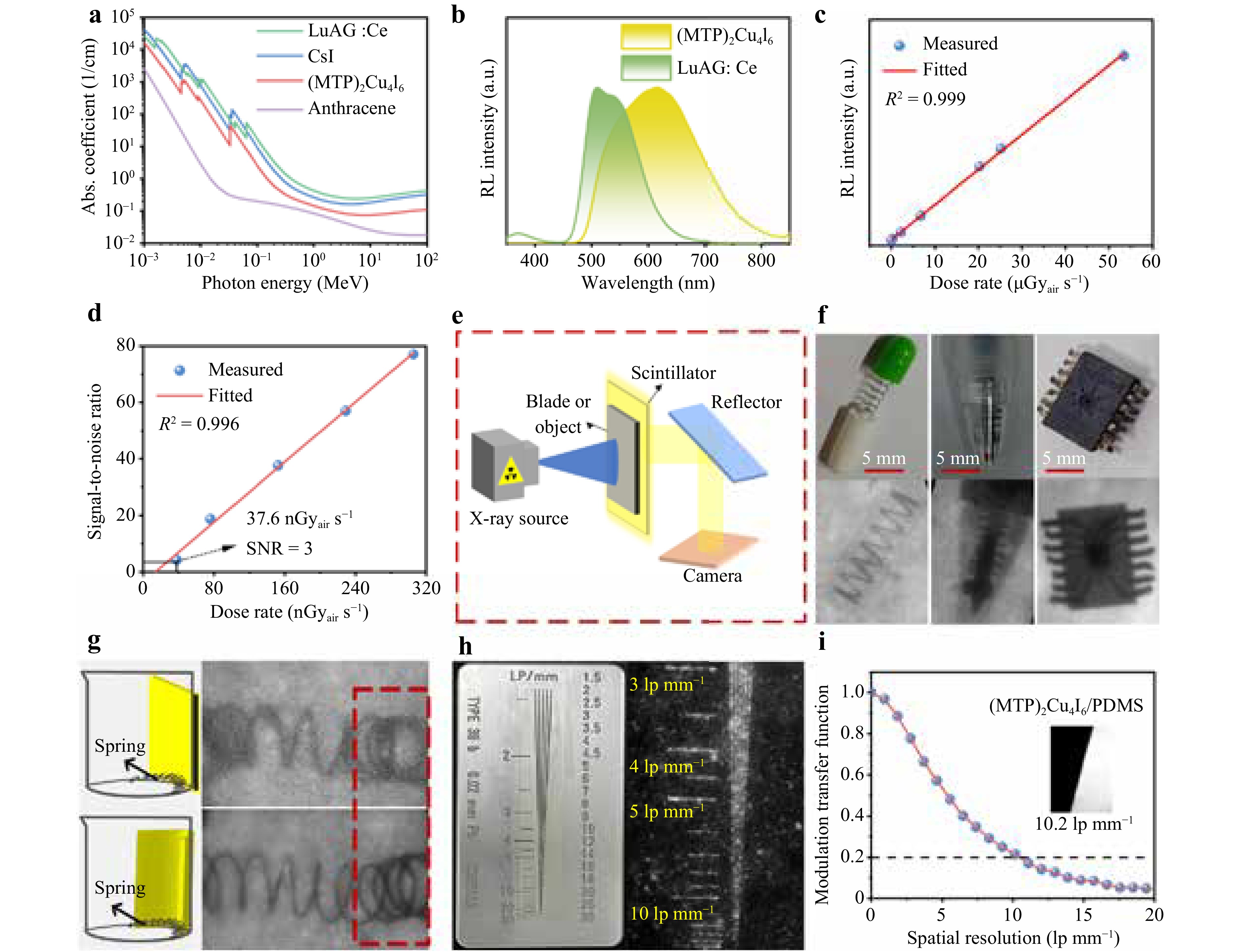 Fig. 4 a Absorption coefficients of (MTP)2Cu4I6, CsI, LuAG:Ce, and anthracene as a function of photon energy (from 1 keV to 100 MeV). b Radioluminescence (RL) spectra of (MTP)2Cu4I6 and LuAG:Ce under X-ray irradiation conditions. c Linear response of (MTP)2Cu4I6 covers a large range of four orders of magnitude from 0.038 μGyair s−1 to 53.4 μGyair s−1. d Signal-to-noise ratio (SNR) value versus the dose rates. e Illustration scheme of the X-ray imaging system. f Photographs under ambient light conditions and X-ray images of the objects including a metal spring encapsulated in a capsule, ballpoint pen, and a chip. g Schematic and X-ray images of a spring using planar and nonplanar (MTP)2Cu4I6/polydimethylsiloxane (PDMS) scintillator film adjacent to a beaker. h Photograph and X-ray image of a standard X-ray test-pattern plate. i Modulation transfer function (MTF) of the (MTP)2Cu4I6/PDMS composite film and the measured resolution (when the MTF value is 0.2). The inset shows the X-ray image of the tungsten edge used for MTF measurements.