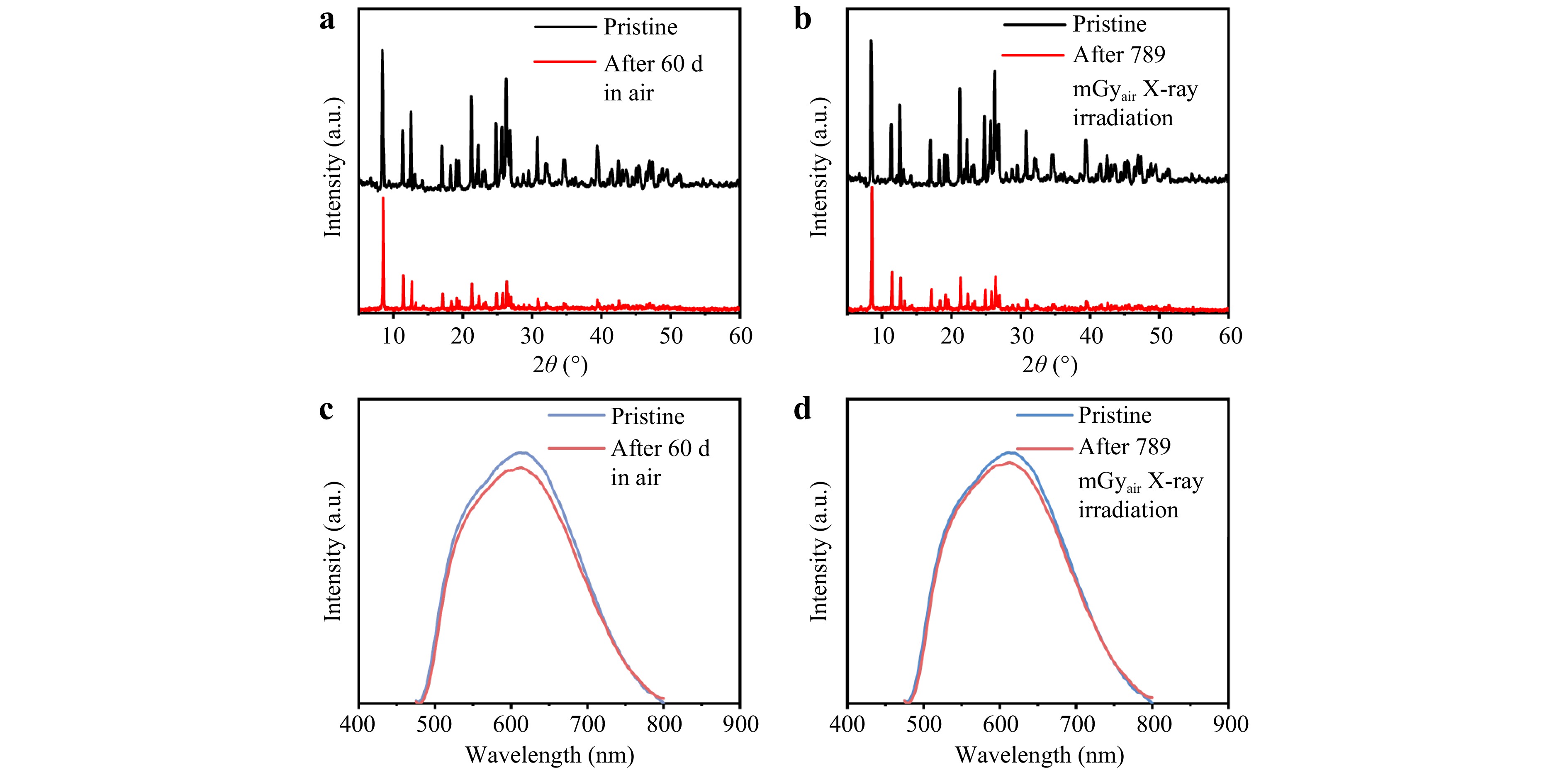 Fig. 5 a XRD patterns of pristine and (MTP)2Cu4I6 after 60 d of ambient storage. b XRD patterns of pristine and (MTP)2Cu4I6 after a total X-ray irradiation of 789 mGyair. c PL spectra of pristine and (MTP)2Cu4I6 after 60 d of ambient storage. d PL spectra of pristine and (MTP)2Cu4I6 after a total X-ray irradiation of 789 mGyair.