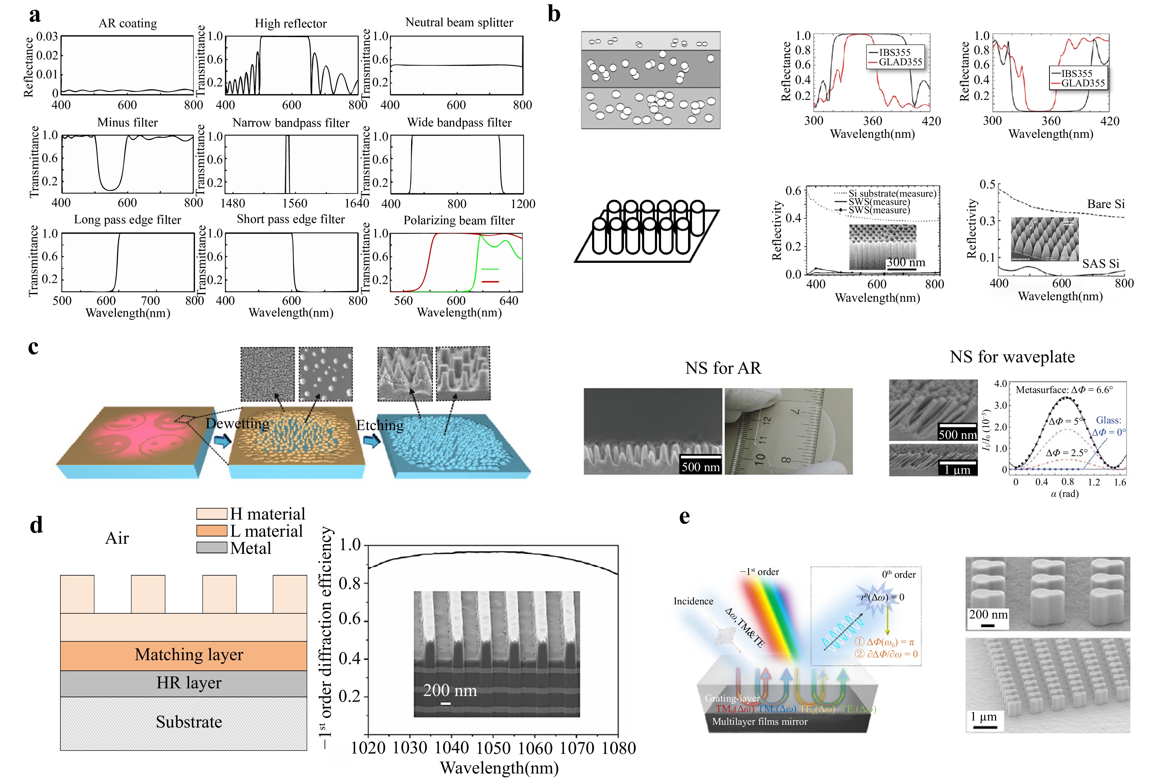 Fig. 1 Optical manipulation of optical coatings. a Spectral performance of typical multilayer mirrors. b Porous10 and textured nanostructures11,12. c Nanostructures evolving from pillars to circular cones for various applications13–15. d Multilayer gratings for broadband efficiency16. e Quasi-3D microstructures by integrating metasurfaces with multilayers17.