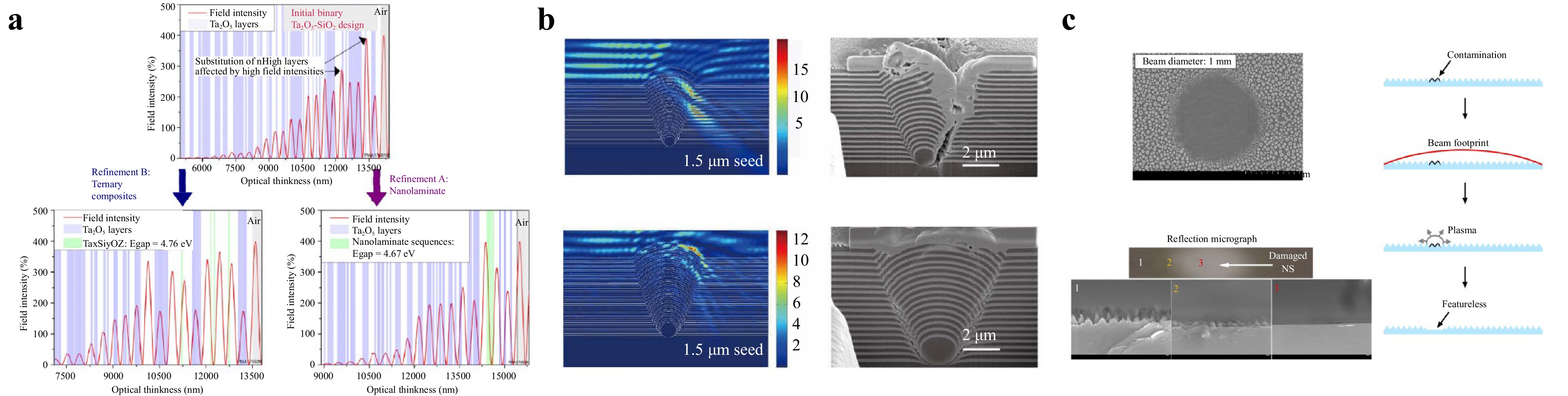Because low-refractive-index materials generally have a larger bandgap than high-refractive-index materials, positioning the EFI peak within the low-refractive-index layer can enhance the overall laser damage resistance (Fig. 5a)107. Bellum et al.109 reported on a TiO2/SiO2 BBLD mirror designed to reduce EFI in high-index materials. This mirror performed well for both S- and P-polarisation scenarios, and laser damage tests under sub-nanosecond and femtosecond pulses demonstrated improved LIDTs. Willemsen et al.107 also demonstrated that replacing the binary Ta2O5 layer, where the EFI was highest, with a nanolaminate sequence or a ternary composite layer with a larger bandgap reduced the maximum field intensity by 190% and 200%, respectively, thereby further enhancing the LIDT. For dispersive MDFs experiencing unexpectedly intense nonlinear responses, Razskazovskaya et al.110 and Gui et al.111 demonstrated that positioning the H layers in a weak electric field and the L layers in a strong electric field can impede the nonlinear absorption and temperature rise. Adjusting the EFI distribution within nodule defects can be realized by modifying the focusing and penetration behaviour of light, and has been applied to multilayers. Cheng et al.112,113 designed a wide-angle reflective HfO2/SiO2 film with a reflection angle bandwidth for P- and S-polarised lights wider than the typical incidence angle for nodal defects. This broadband structure prevented light from penetrating the reflective layer where the nodule defect was located, thereby significantly reducing the electric-field enhancement effect (Fig. 5b). This design caused a 75% reduction in EFI compared to conventional quarter-wavelength HfO2/SiO2 films and nearly doubled the LIDT. Additionally, Ristau et al.51 and Khabbazi Oskouei et al.114 demonstrated that reducing EFI can limit THG.