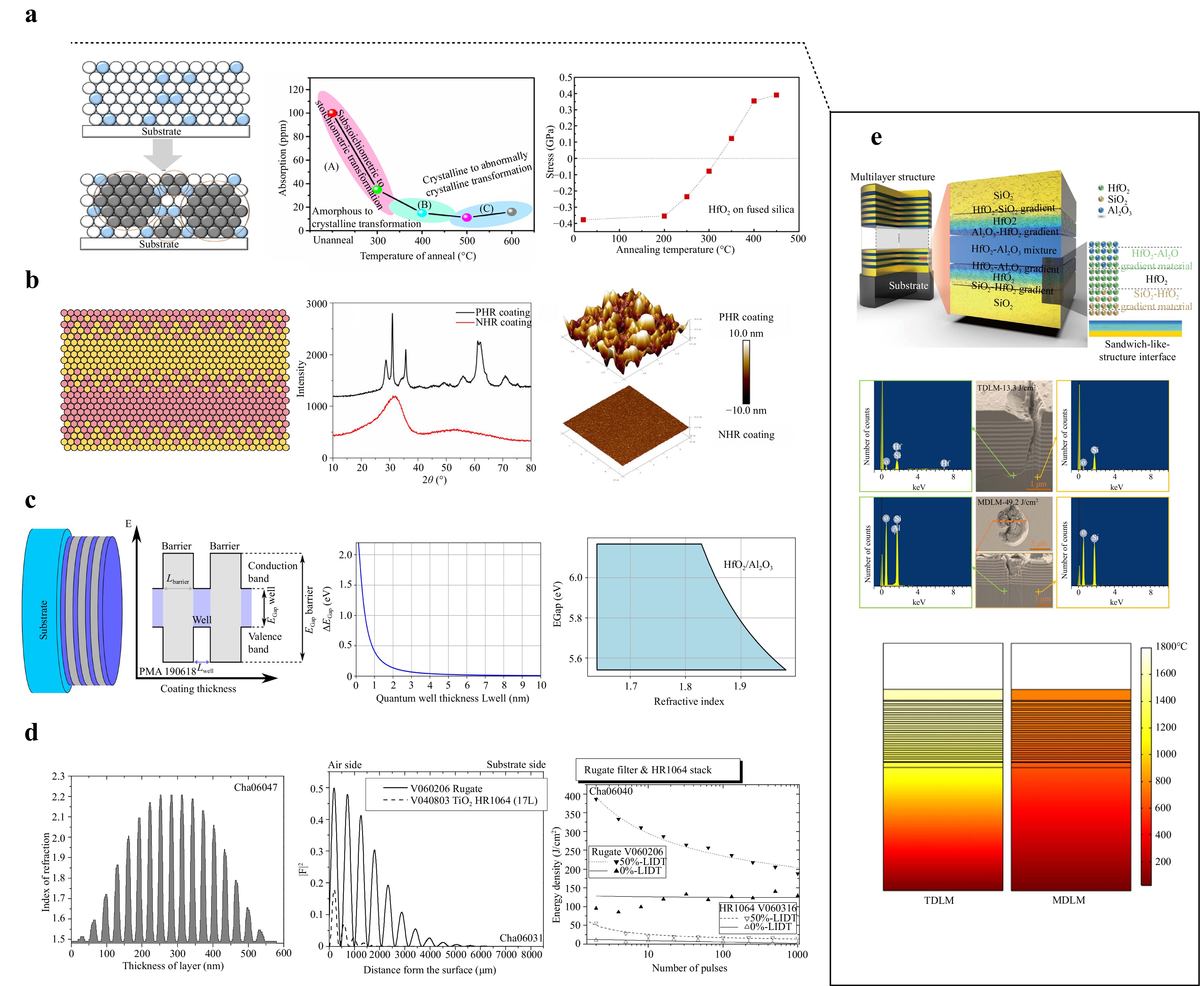 Fig. 6 Material engineering strategies. a Annealing towards reduced absorption and increased stress owing to crystallization122. b Laminating to avoid crystallization at high annealing temperature123. c Nanolaminates and their theoretical optical characteristics towards high LIDT124. d Rugate filter with improved EFI and LIDT125. e Sandwich-like structure to improve the mechanical and thermal duability126.