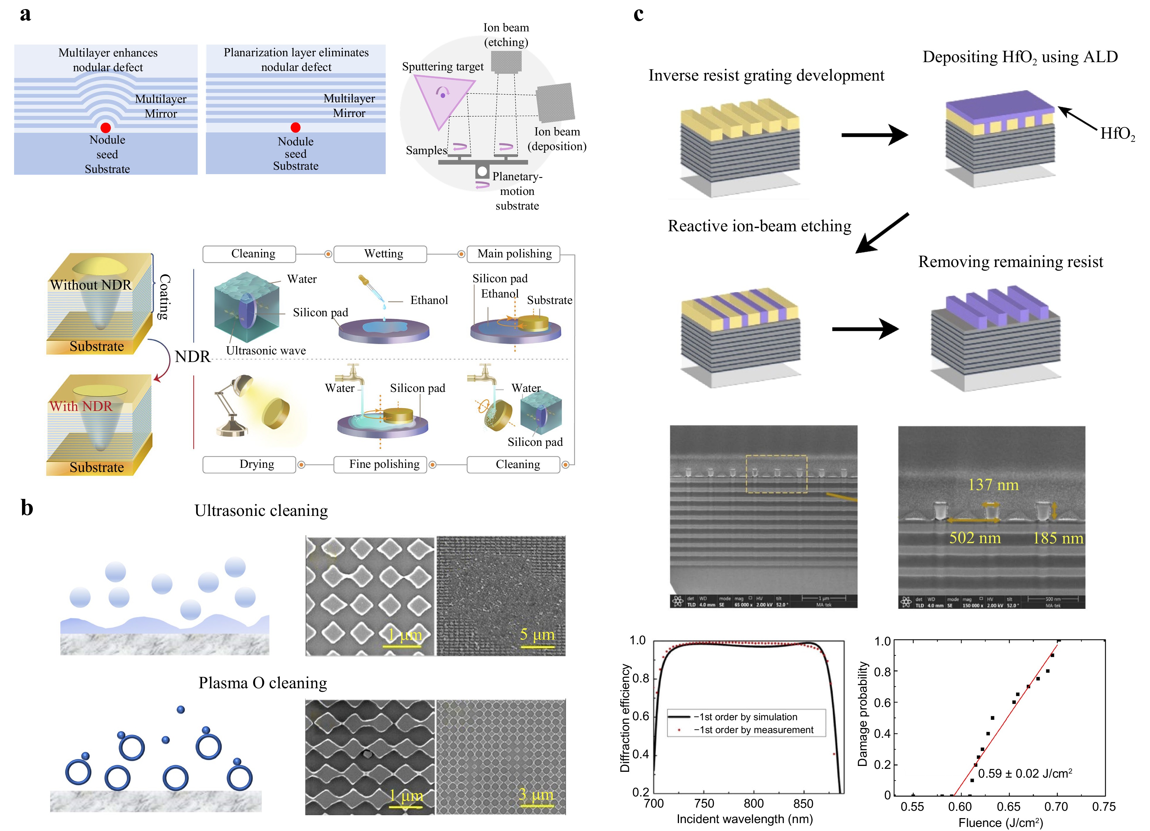 The size of the nano-absorption centres is beyond the detection limit of most conventional detection methods (AFM, profilometry, etc.), and their impact is severe, especially for short wavelengths, as discussed in the previous section. Chemical cleaning, including dry and wet processes, such as plasma cleaning and RCA cleaning, is most widely used to remove nanoscale absorption defects on optical coatings. Wet chemical cleaning uses specific cleaning solutions such as the piranha solution139 and electrostatic repulsion to remove contaminants, which is cost-effective and widely applied in semiconductor industries. Liu et al.137 studied ultrasonic and oxygen plasma cleaning methods for metasurfaces (Fig. 7b). The optimal cleaning method significantly increased the LIDT to 56 J/cm², which is comparable to that of bare-fused silica. Other cleaning techniques such as plasma cleaning140 and gas-phase chemical cleaning have also been applied. However, wet cleaning methods introduce new penetrating impurities, whereas dry cleaning may increase the surface roughness. Furthermore, dry etching frequently introduces nano-absorption centres at the microstructure ridges, which are also the positions that experience the highest EFI. Therefore, their impact on the LIDT was strengthened. To address these issues, Xie et al.117 proposed an additive manufacturing strategy for MDGs that integrated laser interference lithography, nanoimprinting, ALD, and RIBE (Fig. 7c). The MDG achieved almost 90° sidewall angles, reduced the EFI enhancement, and prevented nano-absorbing defects at the ridges. In addition, the self-limiting surface reaction during ALD ensured precise control of the stoichiometric ratios and atomic-level thickness, minimising the structural degradation of high depth-to-width ratio structures and absorptive defects, and further increasing the efficiency.