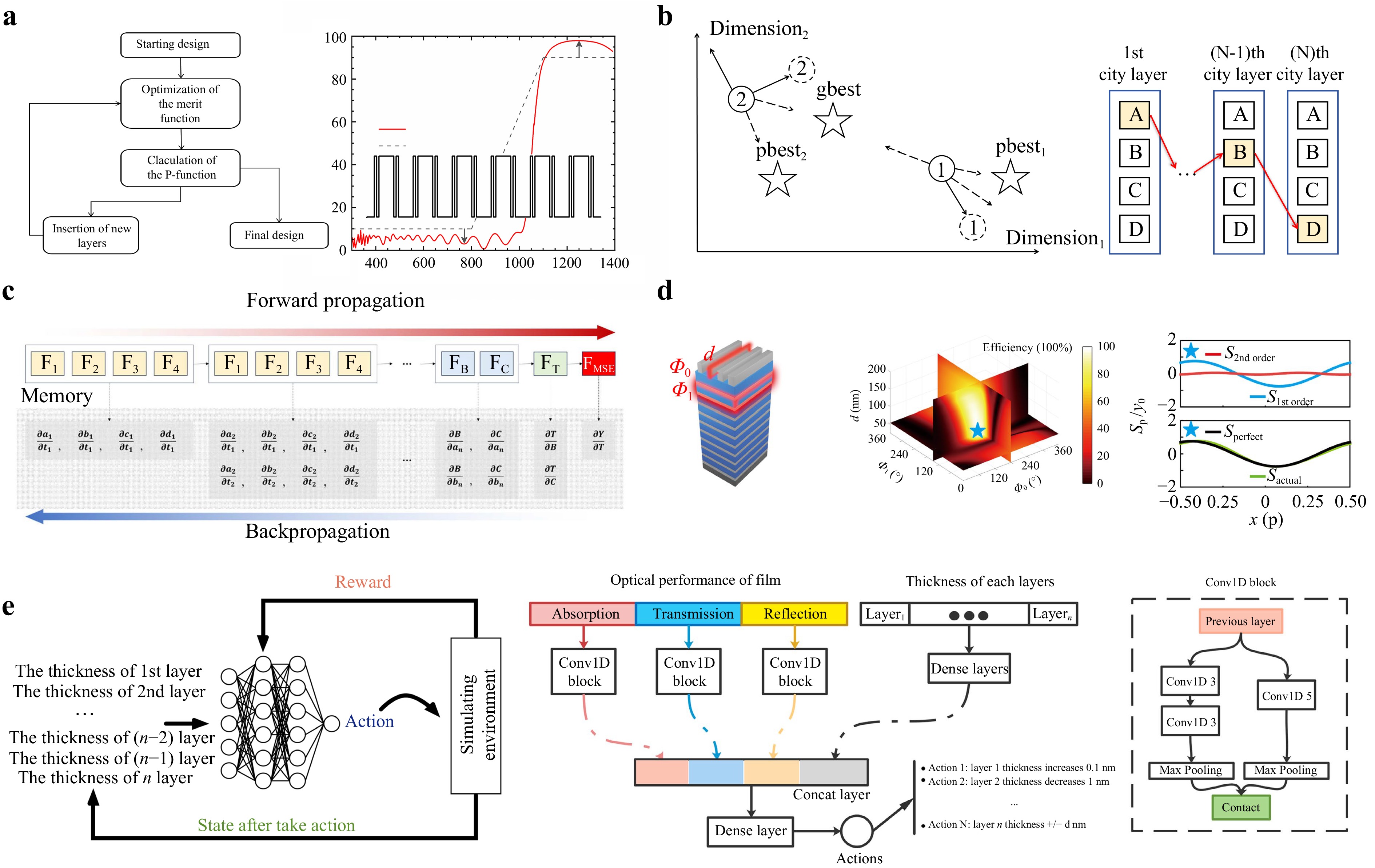 Fig. 8 Inverse designing algorithms for optical coatings. a The needle method. b The particle swarm optimization and colony algorithms. c The neural network algorithm with backpropagation and gradient descent143. d The eigenmode expansion and scattering matrix mode transfer method100. e The deep Q-learning with Markov decision process144.