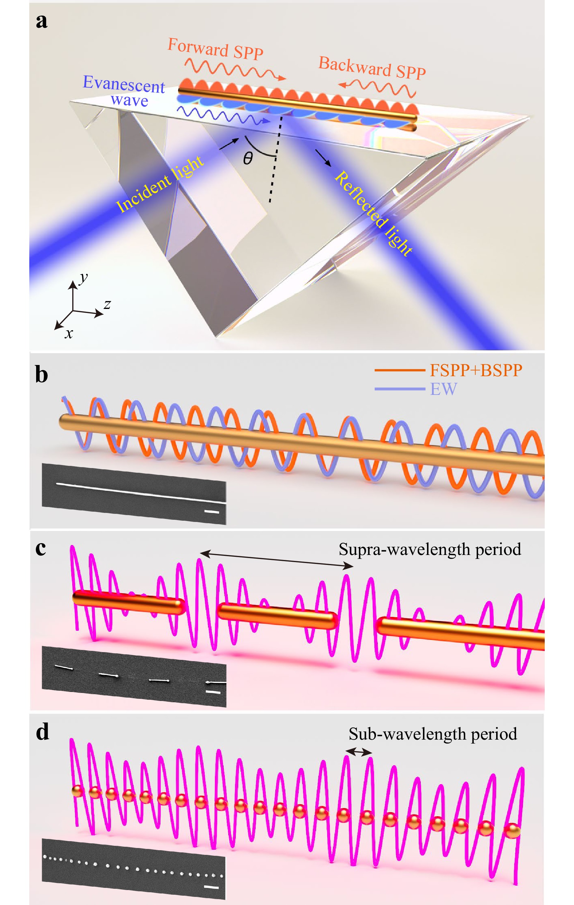 Fig. 1 Schematics of generating 1D plasmonic arrays by leveraging light-driven self-organization. a configuration of a metal NW system supporting multiple waves to generate a periodic electric field distribution. Under illumination of an obliquely incident laser beam, SPPs are excited at the left end-facet and propagate forward, which are called as forward SPPs (FSPPs). The FSPPs travel to the right end-facet and are reflected, causing them to travel backward; these SPPs are named as backward SPPs (BSPPs). Evanescent waves (EWs) also exist at the interface. b illustration of the superposition of FSPPs, BSPPs, and EWs on a NW, which results in a standing-wave or beating effect to form periodic electric fields. Inset scalebar, 500 nm. c formation of metal nanostructure arrays with supra-wavelength periods regulated by spatially modulated |E| distribution. Inset scalebar, 1 μm. d formation of metal nanostructure arrays with sub-wavelength periods. Inset scalebar, 500 nm.