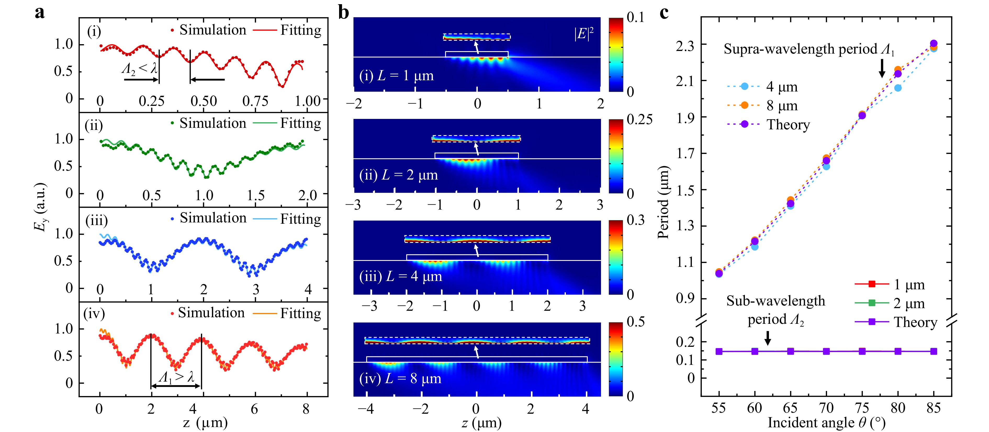 To validate our theory, an electromagnetic scattering study was conducted using the finite element method (FEM) in COMSOL Multiphysics. As shown in Fig. 2a, periodic electric field patterns are naturally formed on the Ag NWs under plane-wave excitation. The patterns obtained from the numerical simulations are in good agreement with those fitted using Eq. 4. This verifies the effectiveness of the simulation and analytical models. The evolution of the field patterns with the NW length varying from 1 μm to 8 μm is also presented in Fig. 2a, b. Noticeably, the sub-wavelength period Λ2 and supra-wavelength period Λ1 dominate in short (e.g., L = 1, 2 μm, Fig. 2a, b(i-ii)) and long (e.g., L = 4, 8 μm, Fig. 2a(iii-iv)) NWs, respectively, which is in agreement with the prediction of our analytical model.