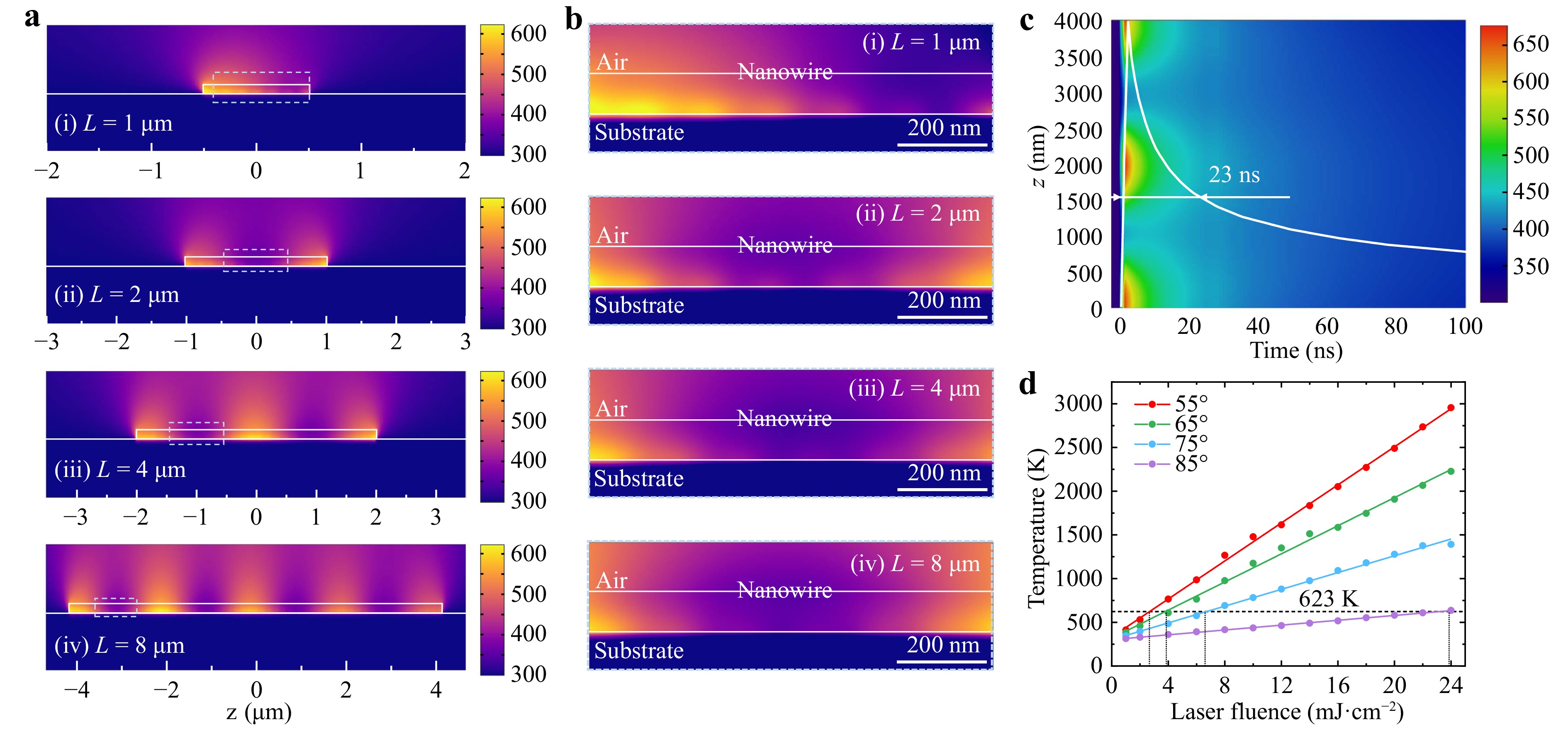Fig. 3 Self-regulated periodic temperature distribution on a single Ag NW. a simulated temperature distributions for NWs with L = 1 (i), 2 (ii), 4 (iii), and 8 μm (iv) at t = 2 ns under a pulsed laser irradiation (pulse duration ~2 ns) with a laser fluence of 24 mJ cm−2 and θ = 75°, respectively. b close-up views of the areas marked by the light blue rectangles in (a) for better clarification of the sub- and supra- wavelength periods evolution. c transient temperature distribution of a 4-μm-length Ag NW excited by the pulsed light. d maximum achievable temperature (Tm) under a single pulse irradiation versus the laser fluences under different θ.