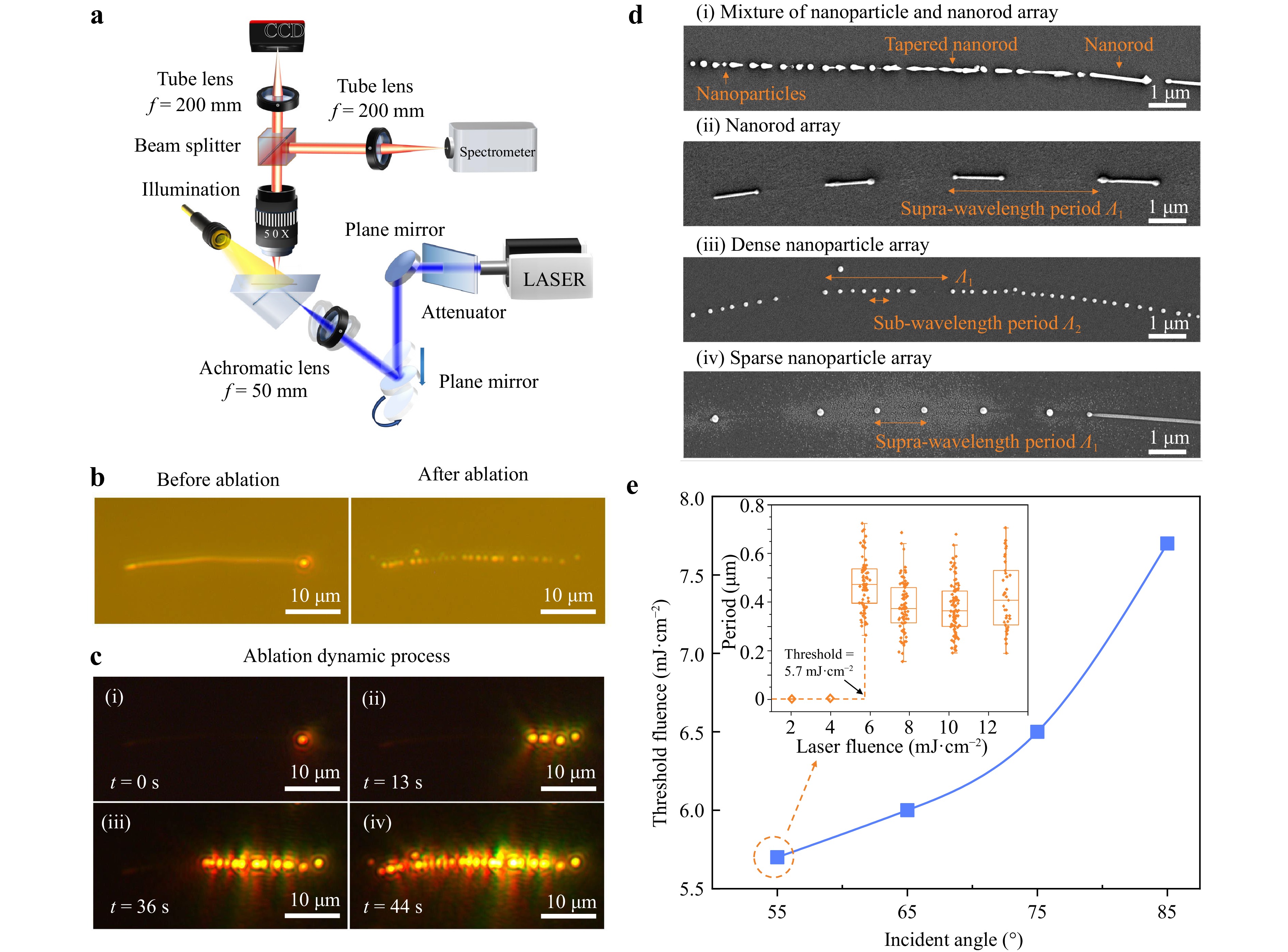 Fig. 4 Experimental demonstration of generating 1D NP arrays from Ag NWs. a Schematic of the oblique-incidence nanosecond pulsed laser irradiation system to fabricate plasmonic arrays and the side-illumination microscope system to observe the ablation process. b Optical microscopy images in bright field of a Ag NW before and after the laser ablation. c Optical microscopy images in dark field of a Ag NW at t = 0 s (i), 13 s (ii), 36 s (iii), and 44 s (iv) after the laser is on, manifesting the ablation dynamics. d SEM images of typical morphologies of the plasmonic arrays, including a mixture of NP and nanorods (i), nanorod (ii), dense NP (iii), and sparse NP arrays (iv). e The dependence of ablation threshold fluence on the incident angle of the laser beam. Inset shows the ablation periods of dense NP arrays versus laser fluence at an incident angle of 55°.