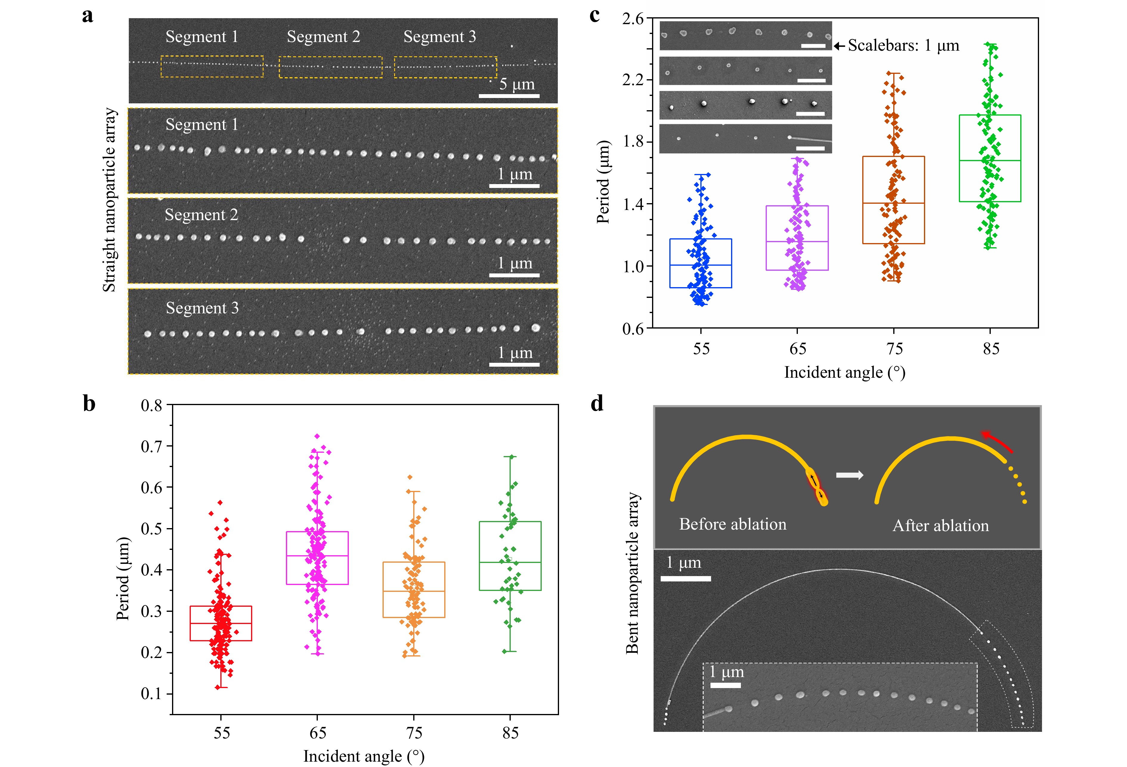 Fig. 5 Generating high-quality plasmonic arrays with tunable parameters. a SEM images of a long-distance dense NP array. Insets (ii-iv) are close-up views of three different segments (marked by orange rectangles) on the NP array in (i). b periods of dense NP arrays versus the incident angle of the laser beam. c periods of sparse NP arrays versus the incident angle of the laser beam. Insets are typical SEM images of the arrays under incident angles of 55°, 65°, 75°, and 85°, from up to bottom, respectively. d schematics (up panel) and SEM images (bottom panel) of curved NP arrays.