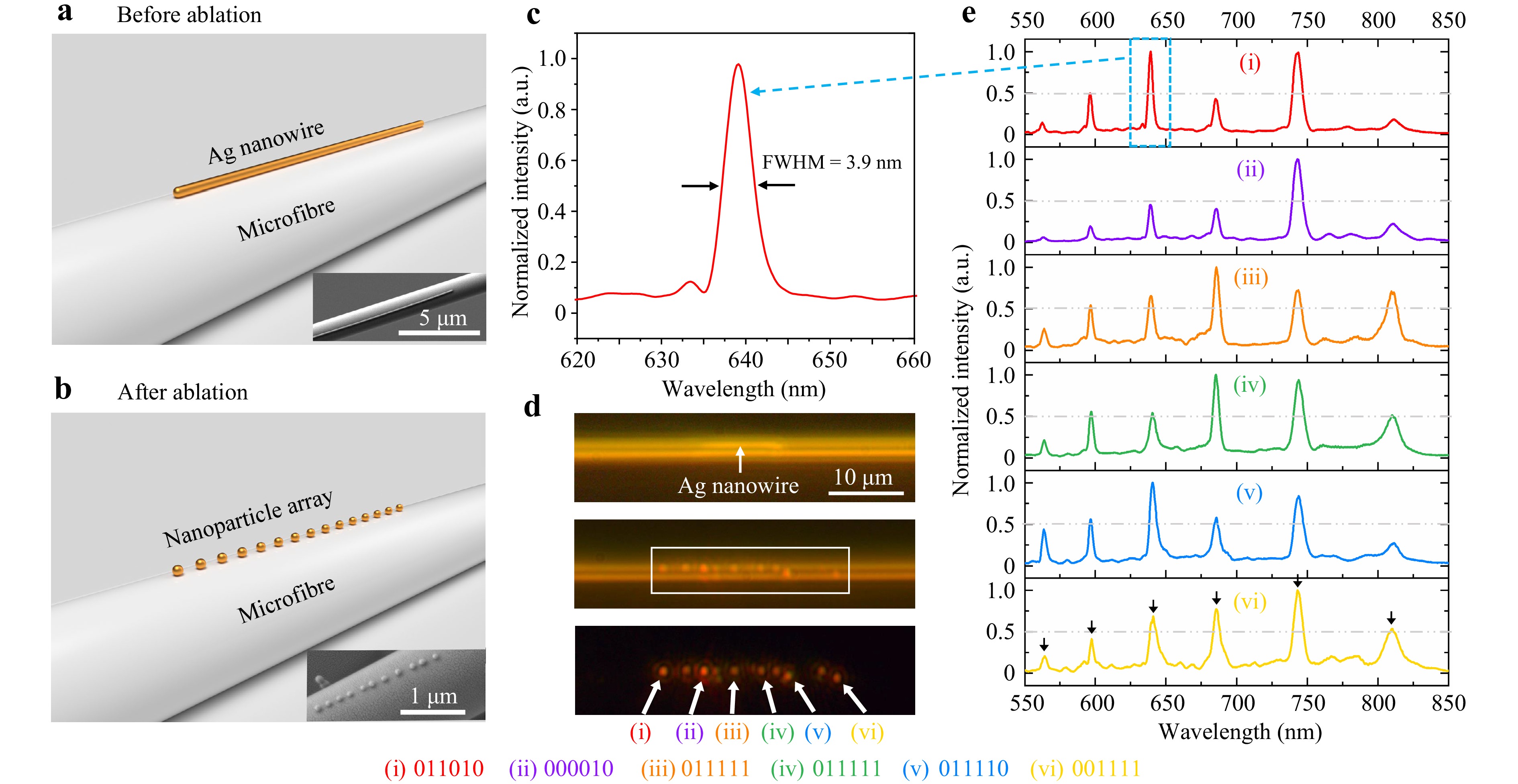 Finally, this method can be extended to generate 1D metal NP arrays directly on curved substrates or microstructures. As a conceptual proof, a single Ag NW was first deposited on an ~1.4-μm-diameter microfibre drawn from a standard optical fibre using the flame-heated taper pulling method65 and then exposed to laser pulses (Fig. 6a). The figure shows that after laser ablation, the Ag NW forms a chain of periodically patterned NPs with a period (~150-240 nm) and an average particle size (approximately 70 nm) beyond the diffraction limit (Fig. 6b), which is highly suitable for high-resolution distributed microfibre optical sensing. Supra-wavelength periods are also obtained. In this case, each NP couples with the whispering gallery mode of the microfibre to form a set of plasmonic-photonic hybrid microcavities with high-quality resonances14 (Fig. 6c-e). The resonance linewidth is compressed to 3.9 nm at a wavelength of ~640 nm (Fig. 6c), corresponding to a Q factor of 164, which is much higher than those of pure microfibres (~10) and a single Ag NP (~10)66. In addition, owing to the variation in the orientations of the NPs on the microfibre surface as well as the slight differences in the individual NP geometries66–68, each NP-microfibre-coupled system exhibits different scattering spectral features and can serve as a unique barcode. As shown in Fig. 6e, approximately six fixed resonance wavelengths exist within the spectral range (indicated by black arrows). Information of the normalized intensity of the resonance peak exceeding 0.5 or not is encoded as “1” or “0”, respectively, thereby indicating the presence (“1”) or absence (“0”) of a certain resonance mode. For example, the barcode of the first NP is read as “011010” (red curve in Fig. 6e). The maximum number of unique barcodes for the coupled system is 26 = 64. Using ten NPs in series, it would be possible to individually tag 26 × 10 ≈ 1018 targets, which can be potentially used in multiplexing applications that require numerous unique barcodes, such as cell tagging, anticounterfeiting, and product labelling69,70.