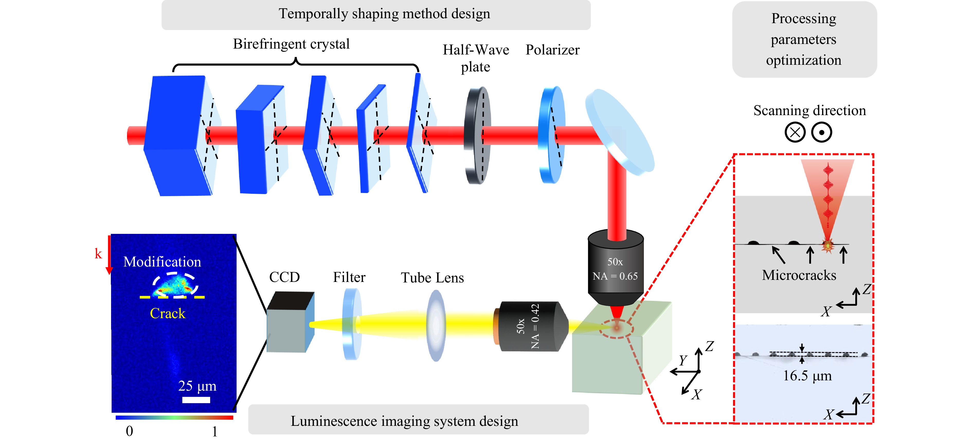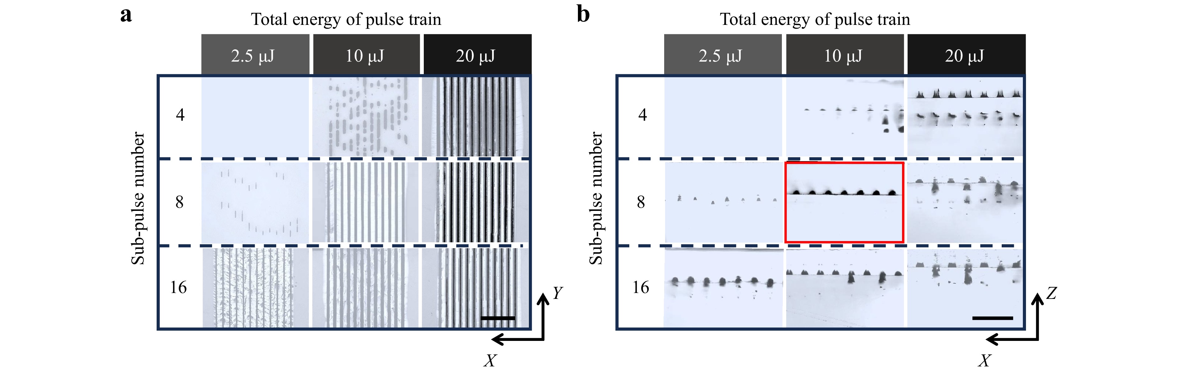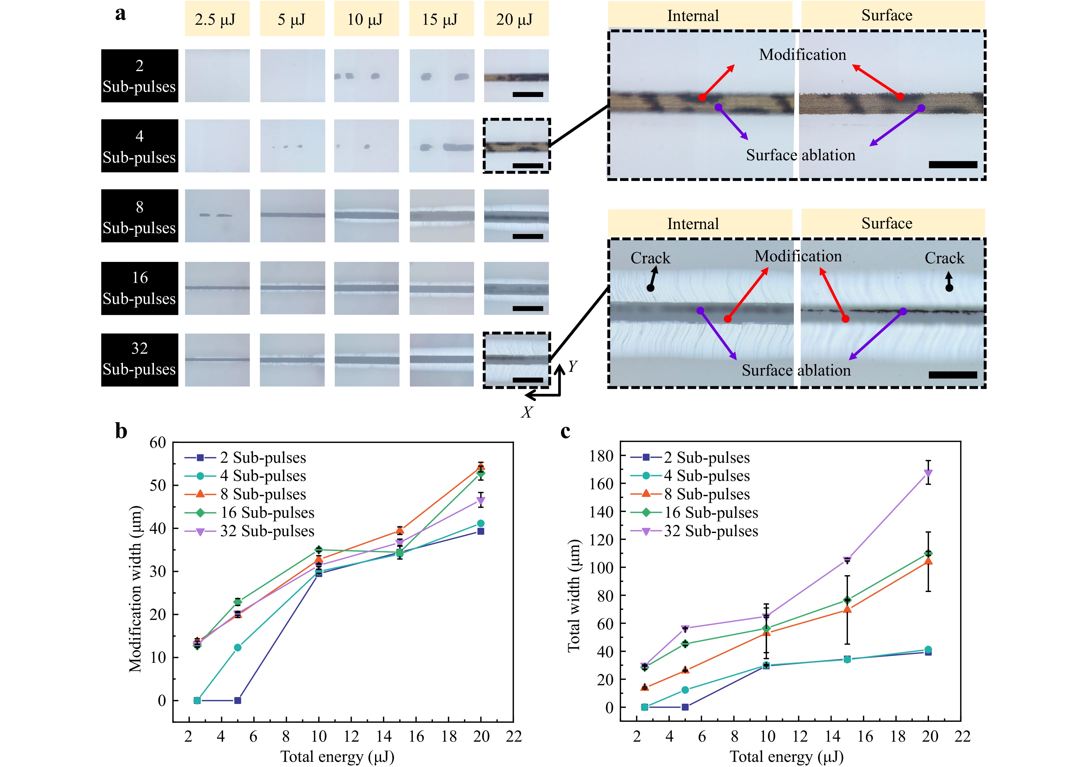 Therefore, the width of the modification line in the crystal is mainly controlled by the applied total energy, while the crack propagation width is influenced by both the total energy and the number of sub-pulses in pulse trains.