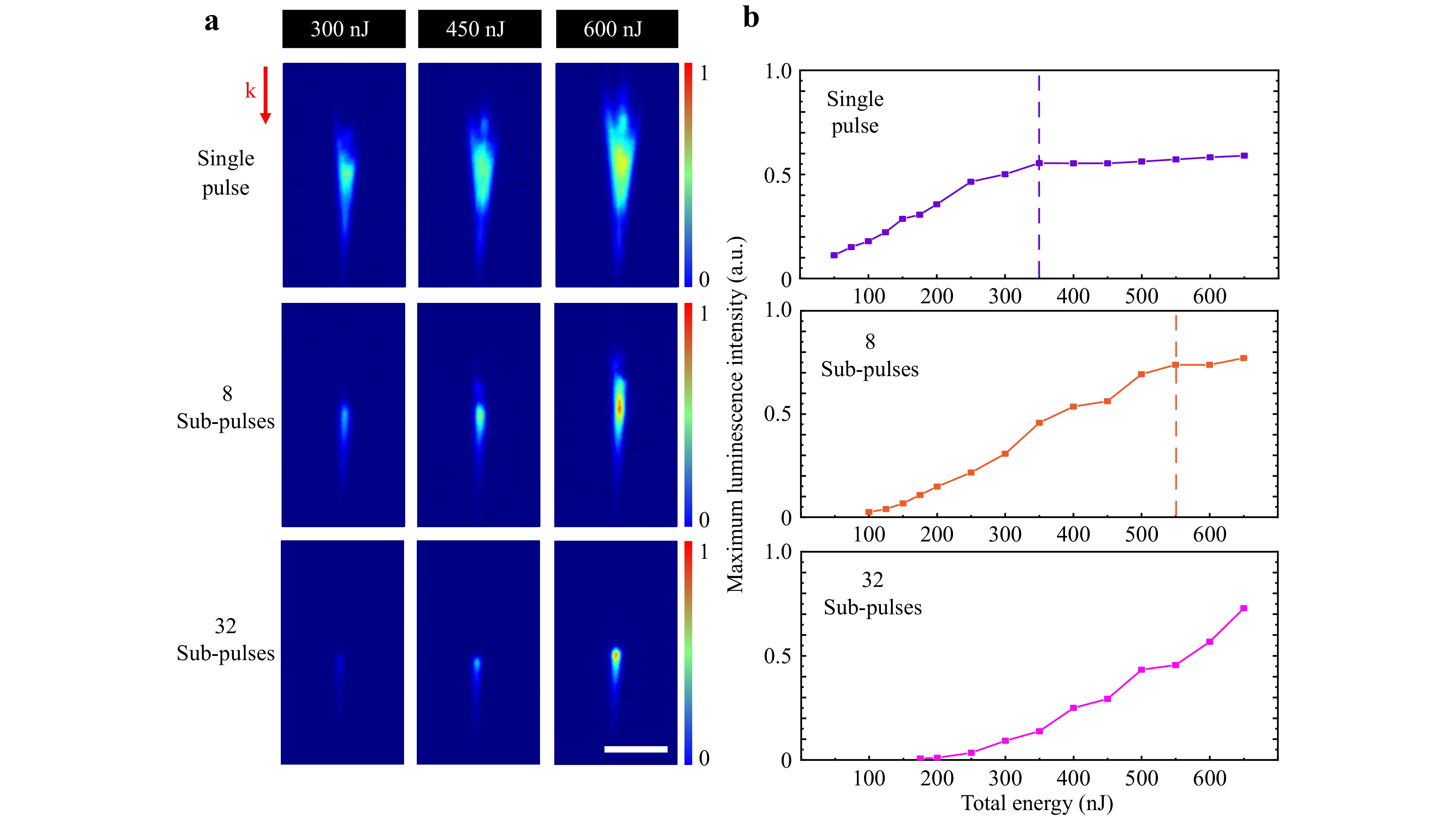 Fig. 4 a Internal luminescence images for varying total energies of single pulse or pulse train and sub-pulse numbers for irradiations. The scale bar represents 20 μm. b The maximum of luminescence signal distributions (normalized) measured for total energy from 50 nJ to 650 nJ comparing the response for single pulse, and with trains of 8 or 32 sub-pulses.