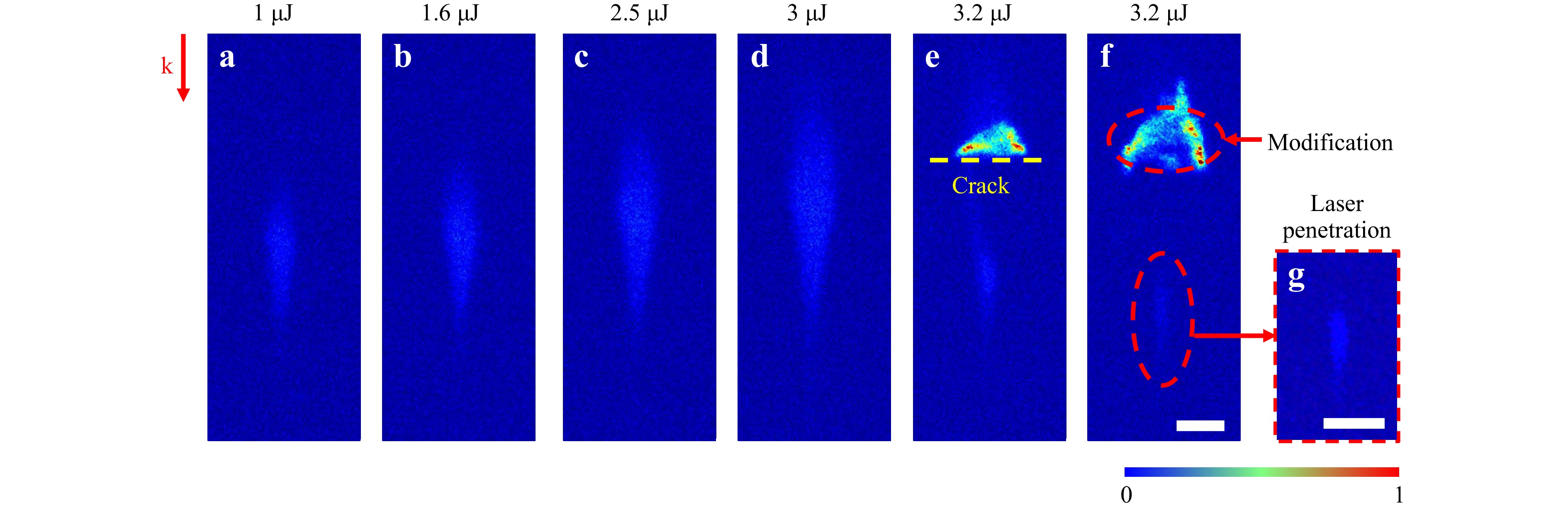 Further characterization of the pre-focal plasma responses was conducted. Fig. 5 shows side luminescence imaging for irradiation with 8 sub-pulses while increasing the total energy. For these experiments, the laser repetition rate is set to 1 kHz, the CCD adjusted gain to 48 dB, and exposure time to 1/32 s. As the total energy increases from 1 μJ to 3 μJ, pre-focal luminescence strengthens. As shown in Fig. 5e, at 3.2 μJ, internal modification and crack induction occur at a plane located prior to geometrical focus, blocking energy delivery for the subsequent irradiations in this pre-focal modified-crack region. Fig. 5f shows an image taken 62.5 ms after the one in Fig. 5e, where it can be observed that repeated irradiations only cause the modified layer to grow upwards. Fig. 5g is a magnified view of the red circle in Fig. 5f. Below the crack-modified layer, carrier luminescence is still visible, indicating that the incident laser is still depositing energy beneath the modified layer. Therefore, we speculate that the multi-layer modification beneath the crack layer, caused by a higher number of pulses or greater energy, is due to the remaining light reaching the focal point after propagation trough the pre-focal crack layers.