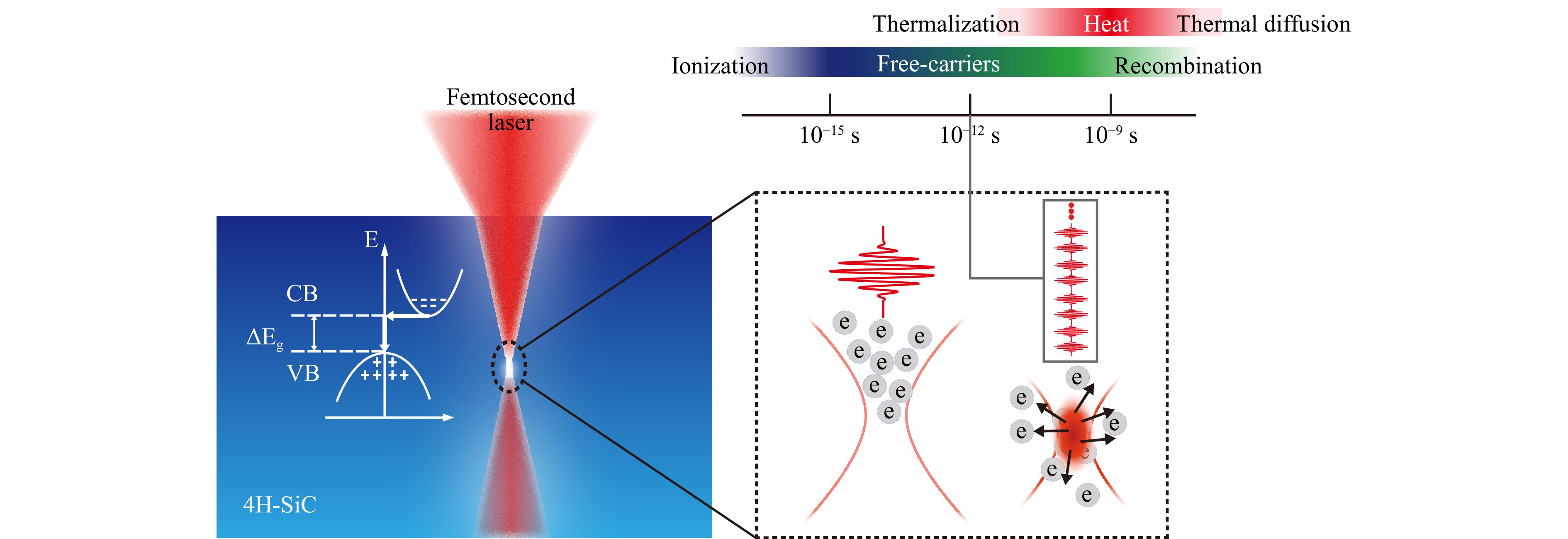 Laser-assisted slicing is a non-contact, wear-free, and dry slicing technique that holds significant promise in the semiconductor wafer slicing industry. This technique involves focusing a laser to a fixed depth inside the crystal, where laser energy deposition induces internal modification and crack formation9. The wafer can be separated along the modification-crack layer using mechanical stretching10,11, cold split12 or photo-electrochemical etching13. By controlling the local interaction process and the laser-induced modification, it is possible to effectively minimize the sacrificial layer, reducing material loss associated the slicing process. Femtosecond laser, with its high peak energy, can induce multiphoton ionization inside wide-bandgap semiconductor materials, enabling precise internal modification or ablation of the material14,15. Karki et al. conducted a series of experiments, which demonstrated that four-photon absorption dominates in silicon carbide under femtosecond laser excitation16. Compared to traditional long-pulse lasers, femtosecond lasers offer the advantage of reducing the thermal effect of the process. This can reduce the size of the heat affected zone and heat-induced mechanical stress and thus minimize material damage near the modification area17,18. Li et al. innovatively employed spiral-trajectory femtosecond laser focusing technology to achieve monolithic fabrication of high-precision three-dimensional light-absorbing helical micro/nanostructures within transparent media19. Therefore, the use of femtosecond laser is a preferential choice for high-precision laser-assisted slicing.