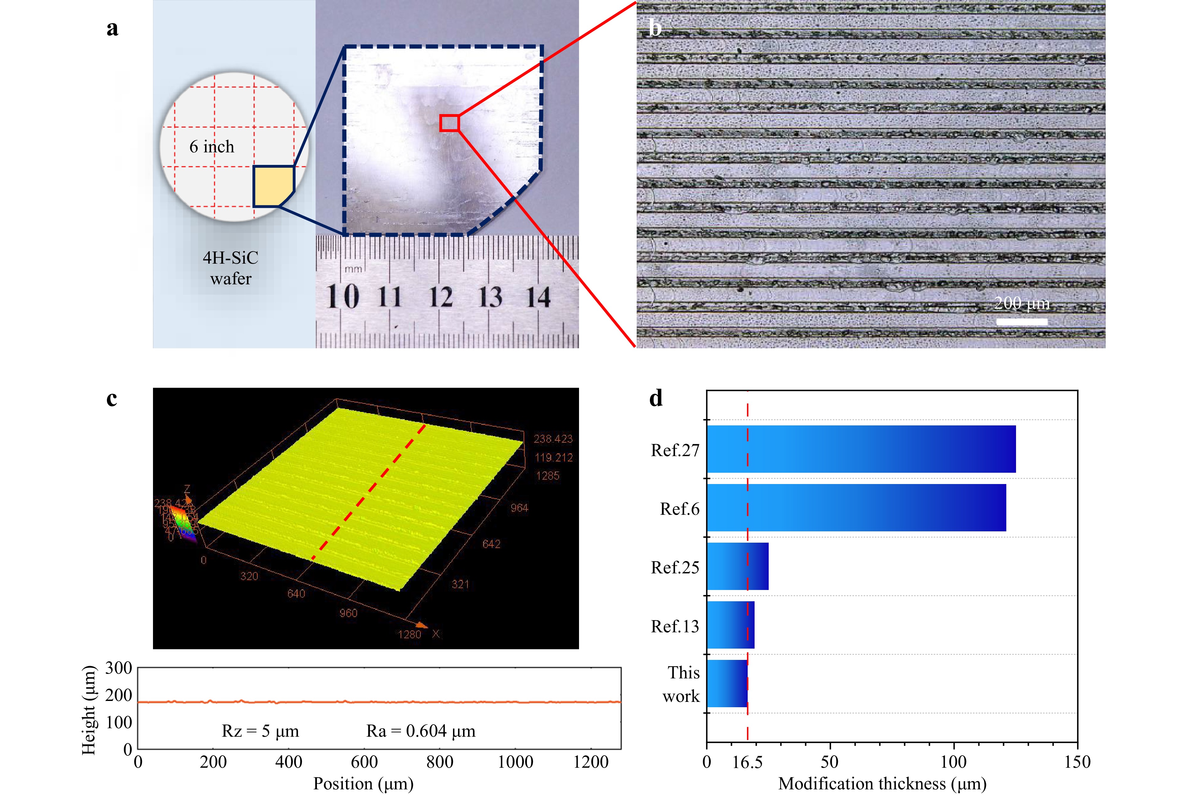 Fig. 7 SiC slicing after large-area scanning of a wafer with ultrafast trains of pulses. a Top view of SiC wafer before slicing. b Top view of optical microscope after wafer slicing. c Confocal microscopy characterization and roughness measurement of sliced wafer surface. d Modification thickness of different works.