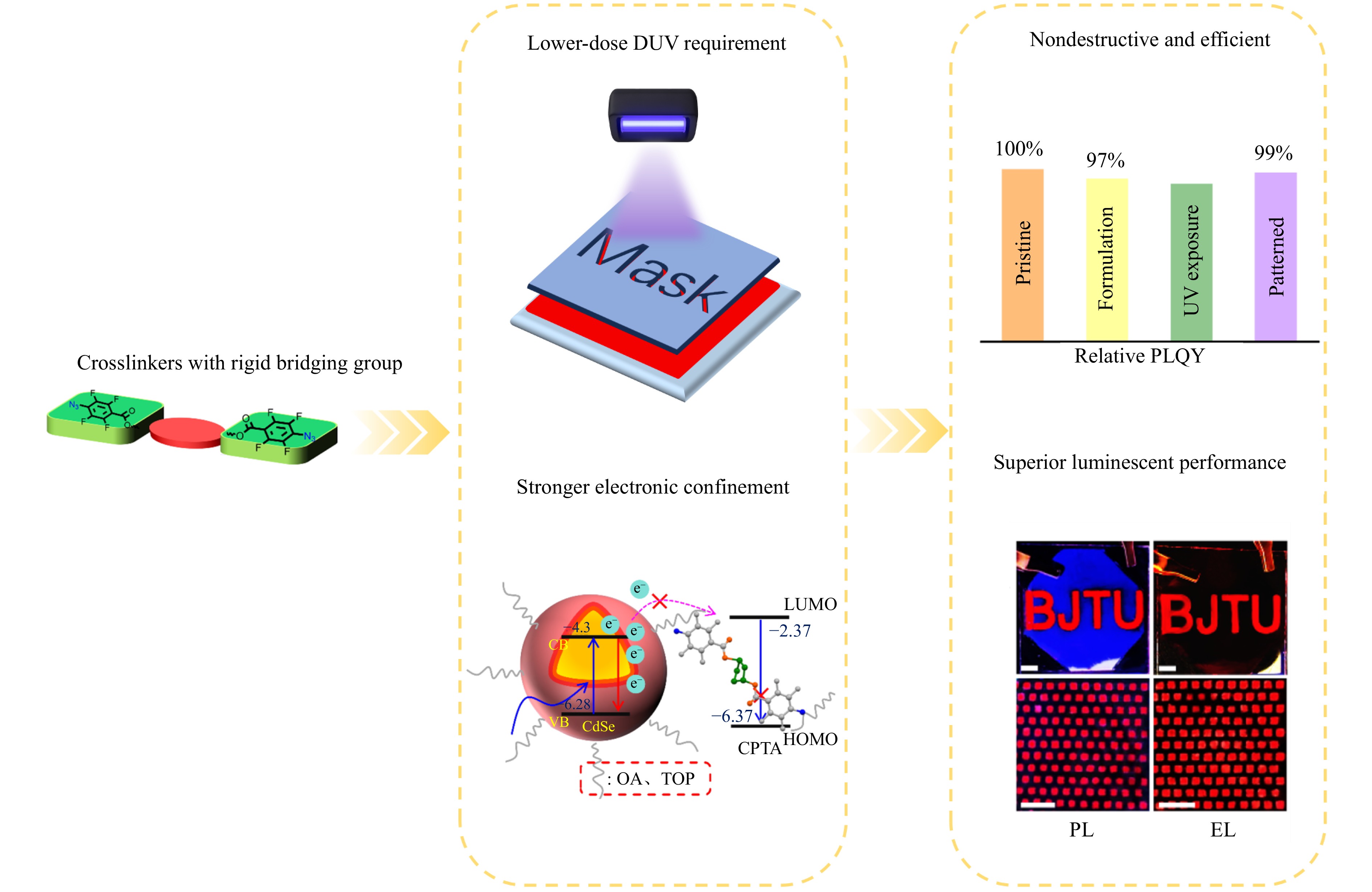 Fig. 1 Schematic of nondestructive, high-quality, high-resolution QD patterning facilitated by a rigid crosslinker. (Left) Structure of the rigid crosslinker. (Middle) Advantages of using rigid crosslinkers in direct photolithography processes. (Right) Nondestructive effects of rigid crosslinkers on QD thin films during direct photolithography, and the demonstration of the resultant device luminescence. Some images are reproduced from Ref. 36.
