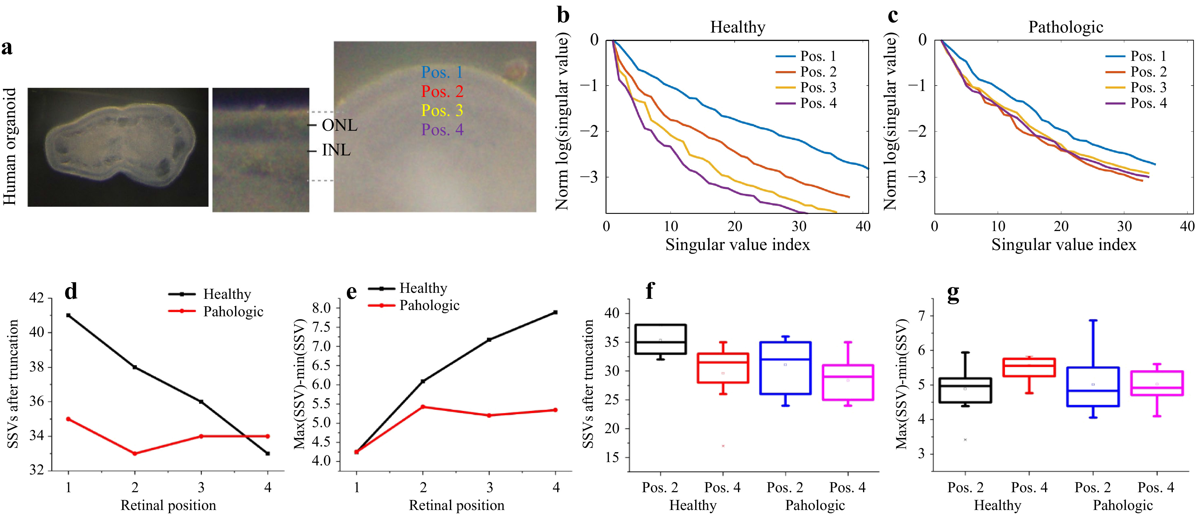 Advanced manufacturing of retinal organoid samples from human induced pluripotent stem cells represents a promising way to study the development of retinal diseases. The retina is an epithelium composed of different cell layers with unique optical properties and detects light by photoreceptor neurons for visual function. There are still many challenges in detecting early and distinct cellular changes in retinal disease. In this paper, we study the capability of the optical transmission matrix, which fully describes the transition of a light field propagating through a scattering sample. Despite its rich information content, the transmission matrix is commonly just used for light delivery through scattering media. Digital holography is employed to measure the complex light-field information of the transmitted light. We demonstrate that singular value decomposition of the transmission matrix allows to discriminate phantom tissues with varying scattering coefficient. We apply these findings to retinal organoid tissues. Application of the protonophore carbonyl cyanide m-chloro-phenylhydrazone (CCCP), a known inducer of retinal damage in animals, caused cell death and structural changes in human retinal organoids, which resulted in distinct changes in the transmission matrix. Our data indicate that the analysis of the transmission matrix can distinguish pathologic changes of the retina towards the development of imaging-based biomarkers.