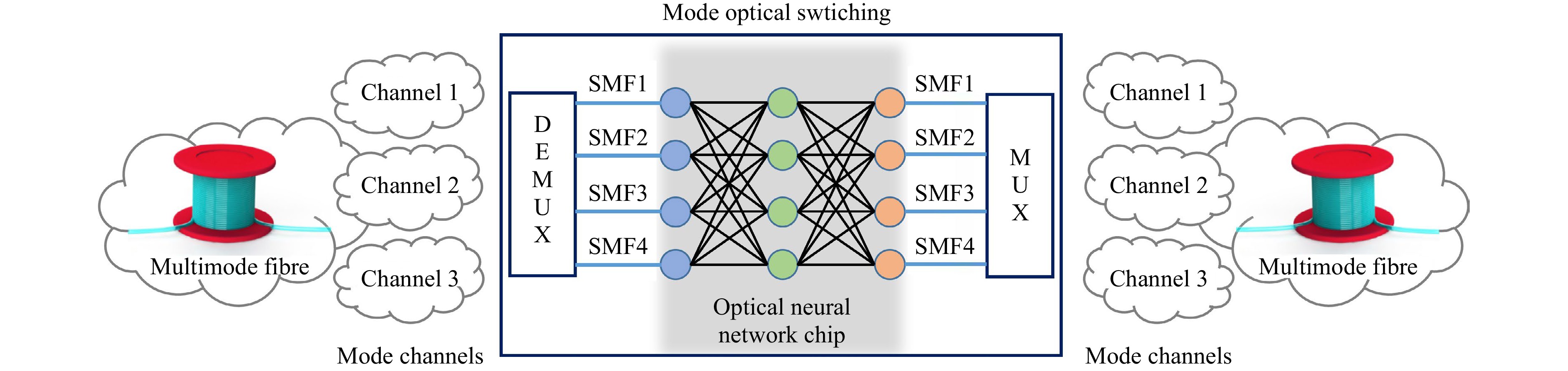 Mode-division multiplexing technology has been proposed as a crucial technique for enhancing communication capacity and alleviating growing communication demands. Optical switching, which is an essential component of optical communication systems, enables information exchange between channels. However, existing optical switching solutions are inadequate for addressing flexible information exchange among the mode channels. In this study, we introduced a flexible mode switching system in a multimode fibre based on an optical neural network chip. This system utilised the flexibility of on-chip optical neural networks along with an all-fibre orbital angular momentum (OAM) mode multiplexer-demultiplexer to achieve mode switching among the three OAM modes within a multimode fibre. The system adopted an improved gradient descent algorithm to achieve training for arbitrary 3 × 3 exchange matrices and ensured maximum crosstalk of less than −18.7 dB, thus enabling arbitrary inter-mode channel information exchange. The proposed optical-neural-network-based mode-switching system was experimentally validated by successfully transmitting different modulation formats across various modes. This innovative solution holds promise for providing effective optical switching in practical multimode communication networks.