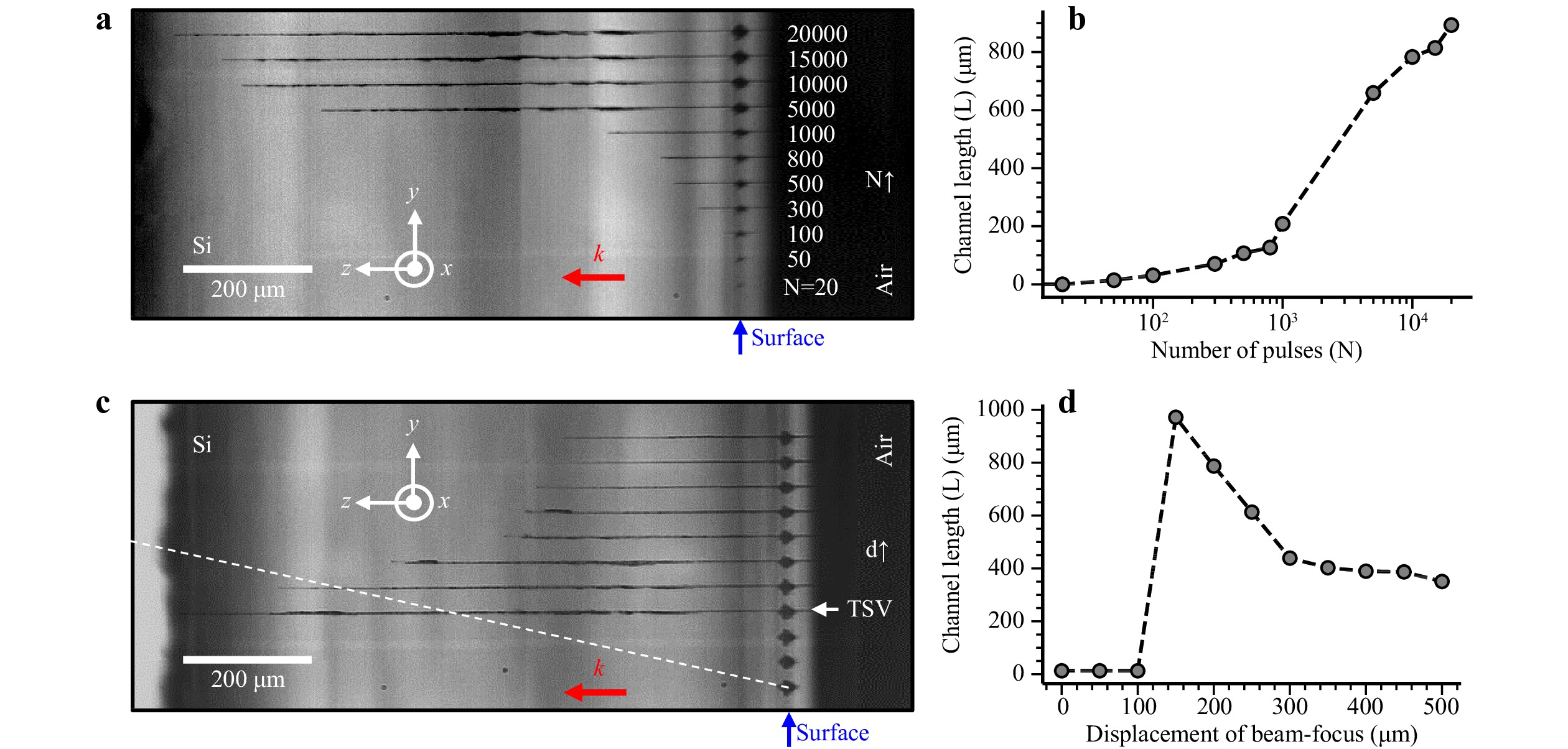 We describe how a direct combination of an axicon and a lens can represent a simple and efficient beam-shaping solution for laser material processing applications. We produce high-angle pseudo-Bessel micro-beams at 1550 nm, which would be difficult to produce by other methods. Combined with appropriate stretching of femtosecond pulses, we access optimized conditions inside semiconductors allowing us to develop high-aspect-ratio refractive-index writing methods. Using ultrafast microscopy techniques, we characterize the delivered local intensities and the triggered ionization dynamics inside silicon with 200-fs and 50-ps pulses. While similar plasma densities are produced in both cases, we show that repeated picosecond irradiation induces permanent modifications spontaneously growing shot-after-shot in the direction of the laser beam from front-surface damage to the back side of irradiated silicon wafers. The conditions for direct microexplosion and microchannel drilling similar to those today demonstrated for dielectrics still remain inaccessible. Nonetheless, this work evidences higher energy densities than those previously achieved in semiconductors and a novel percussion writing modality to create structures in silicon with aspect ratios exceeding ~700 without any motion of the beam. The estimated transient change of conductivity and measured ionization fronts at near luminal speed along the observed microplasma channels support the vision of vertical electrical connections optically controllable at GHz repetition rates. The permanent silicon modifications obtained by percussion writing are light-guiding structures according to a measured positive refractive index change exceeding 10−2. These findings open the door to unique monolithic solutions for electrical and optical through-silicon-vias which are key elements for vertical interconnections in 3D chip stacks.