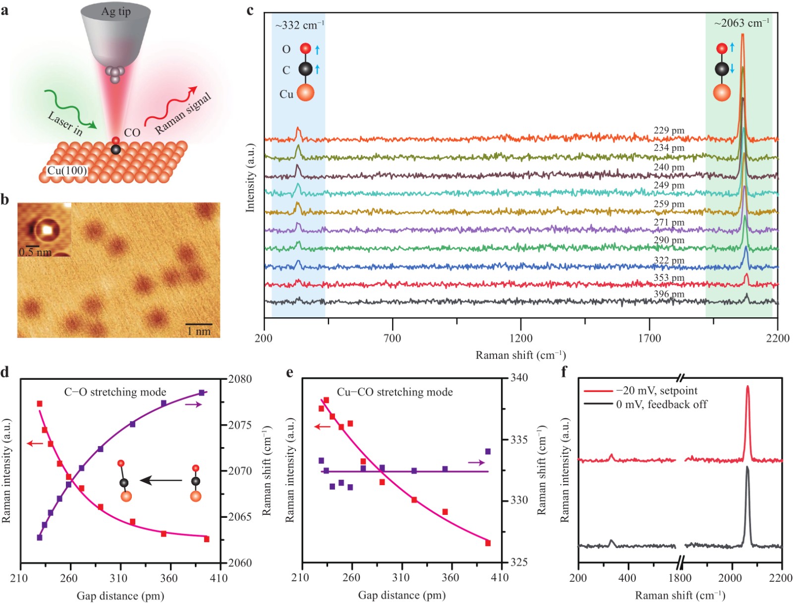 Fig. 2 Evolution of Cu−CO and C−O stretching vibrations during tip approach. a Schematic TERS setup. b STM topograph for a CO molecule on Cu(100) (−1 V, 2 pA). The inset shows a high-resolution image by a CO-terminated tip (−0.02 V, 1 nA). c TERS spectra acquired above the CO molecule on Cu(100) at different gap distances (−0.02 V, 180 s). The zero point of the gap distance (d) is defined as the position when the tip makes a contact to the metal substrate with the conductance reaching the conductance quantum G0. d, e Evolution of peak intensities and Raman shifts on the gap distance for the C−O stretching mode at 2063 cm−1 (d) and the Cu−CO stretching mode at ~332 cm−1 (e), respectively. The peak intensities and their exponentially fitted curve via