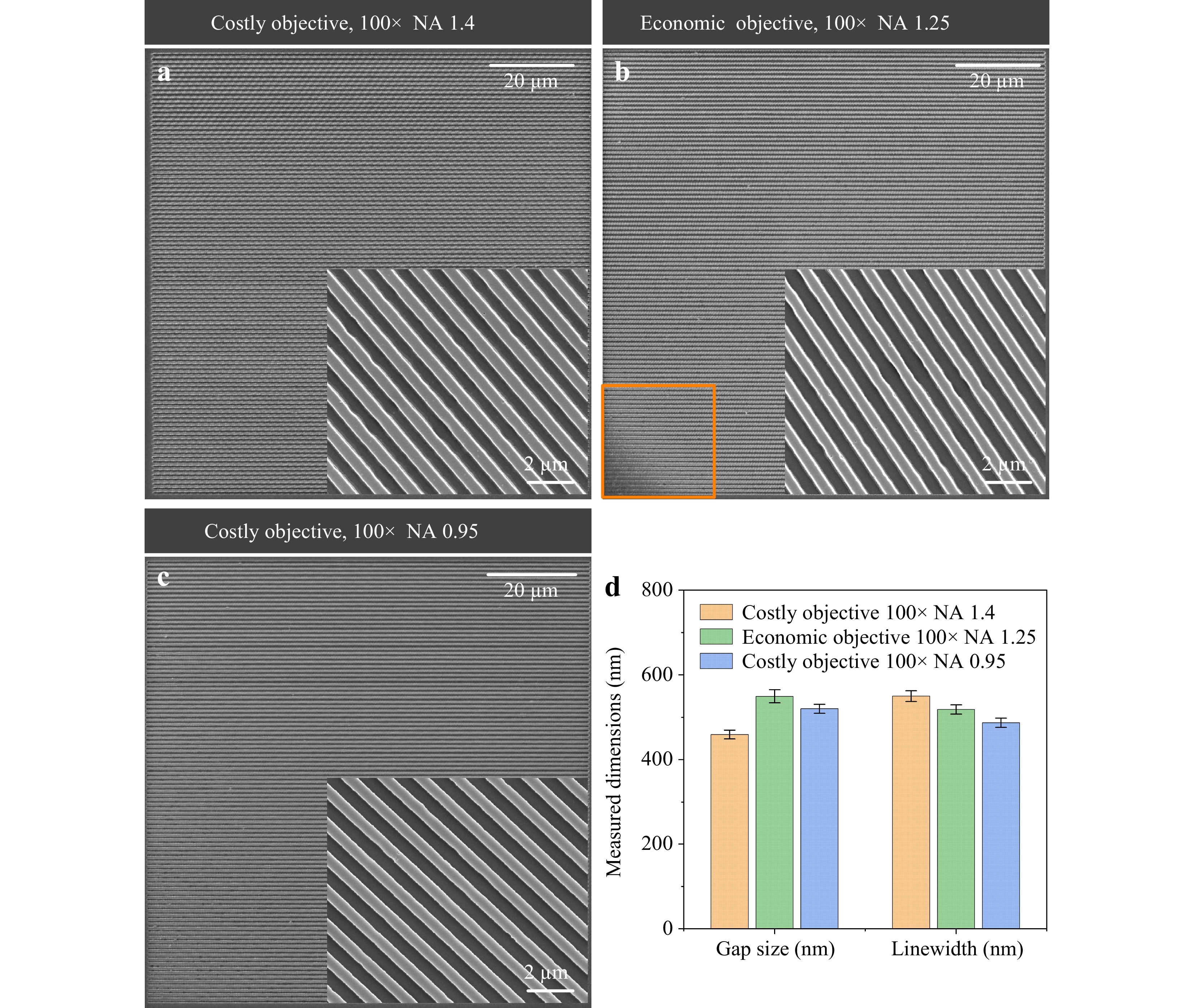 Fig. 4 Gratings fabricated using different microscope objectives. SEM images of gratings fabricated using a costly 100x objective with a NA of 1.4 (a), an economic 100x objective with a NA of 1.25 (b) and a costly 100x objective with a NA of 0.95 (c), respectively. A positive photoresist S1805 was used for the fabrication. The grating arrays produced by the costly objectives exhibit good structure formation, while the grating array obtained using the economic objective has a tiny defocused area. d Measured gap sizes and linewidths of produced gratings. The smaller gap size obtained in the case of costly 100x objective with the NA of 1.4 indicates a narrower exposure region, while the larger gap size obtained with the economic 100x objective with the NA of 1.25 reveals a wider exposure region. The costly objective with the NA of 1.4 exhibits better performance in high-resolution fabrication.