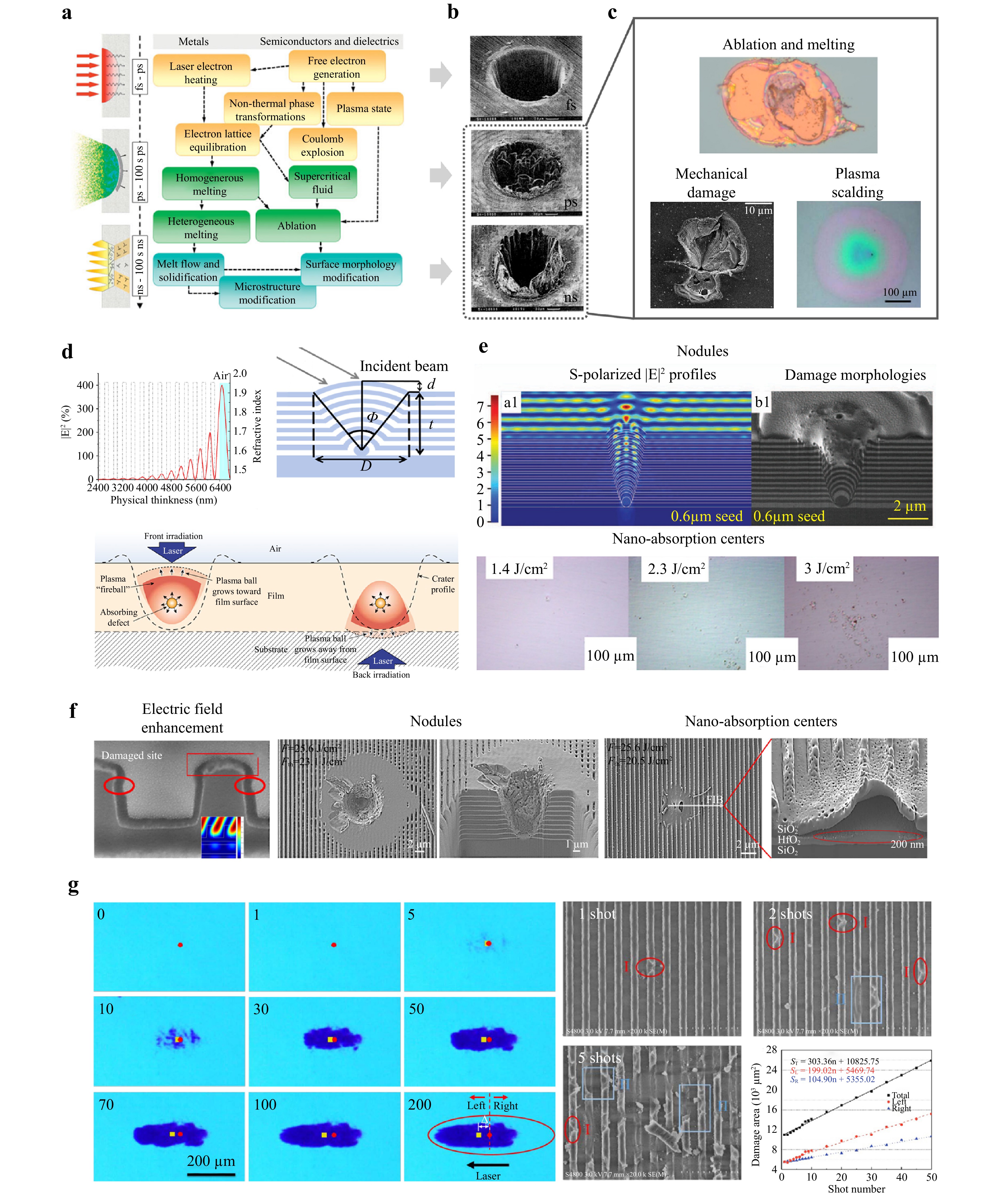 Fig. 2 Laser-induced damage mechanisms and morphological behavior. a The interaction between electrons and photons across fs to ns timescales37. b Typical damage morphologies on multilayers induced by fs, ps, and ns laser pulses38. c Typical damage morphologies on multilayers dominated by thermal melting39, mechanical damage40, and plasma scalding41 under nanosecond laser pulses. d Schematic of the three principal damage precursors: electric field enhancement and visible and non-visible defects42. e Typical damage morphologies on multilayers originated from nodule defects43 and nano-absorption centers44. f Typical damage morphologies on gratings originated from electric field enhancement, nodule defects, and nano-absorption centers45. g Growth sequences on MDGs owing to picosecond pulses at 1053 nm46.