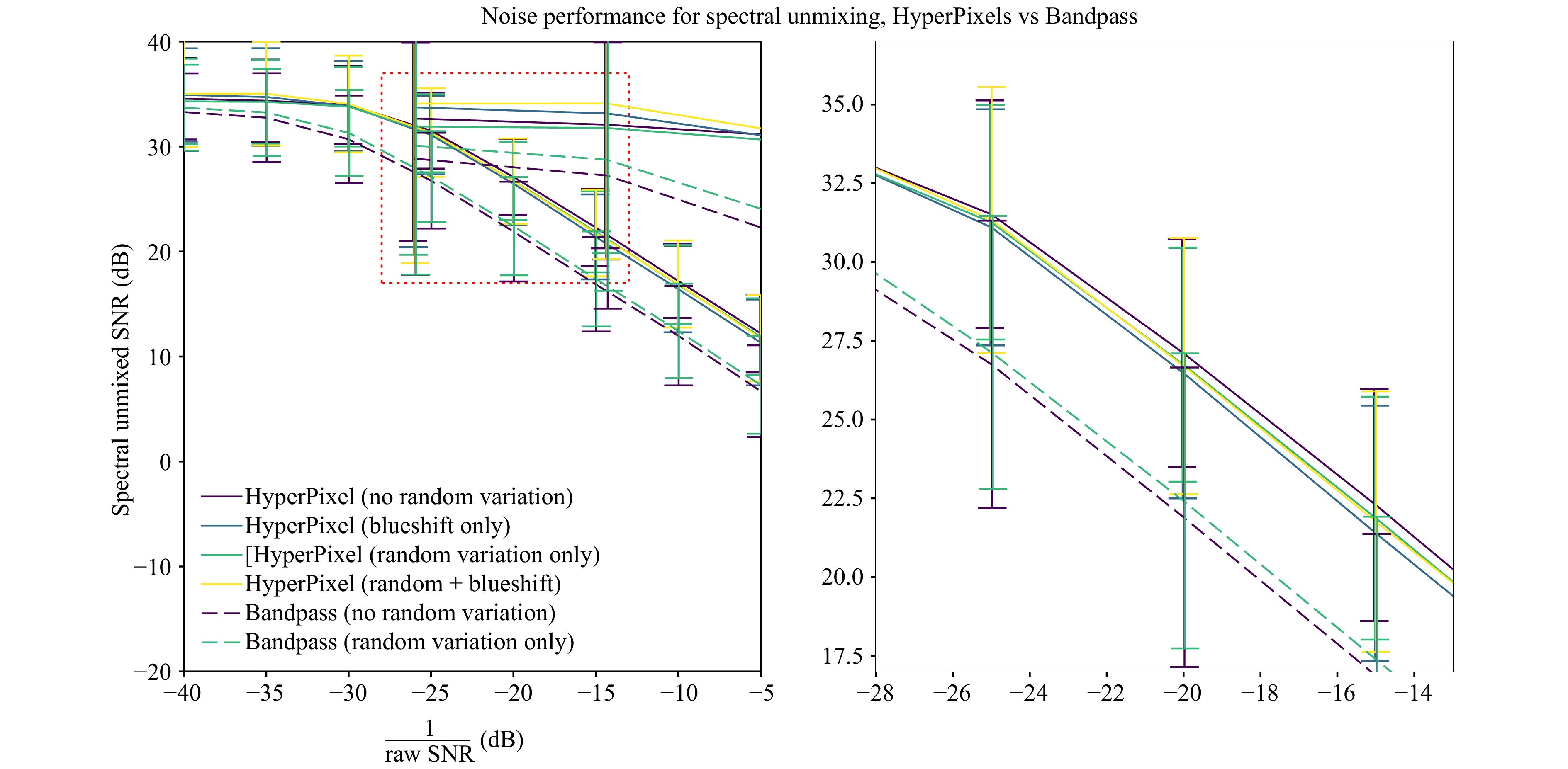 Fig. 4 Simulation results illustrating the unmixed signal-to-noise ratio (SNR) advantage of hyperpixel designs over optimized bandpass filter designs. The simulations account for random height variations in the Fabry-Perot cavities, reflecting experimentally observed fabrication errors, as well as a blue-shift in the fabricated hyperpixels. Despite these variations, hyperpixels consistently demonstrate a significant unmixed SNR advantage compared to optimized bandpass filters. The inset provides a closer view of the red-boxed region for detailed comparison.