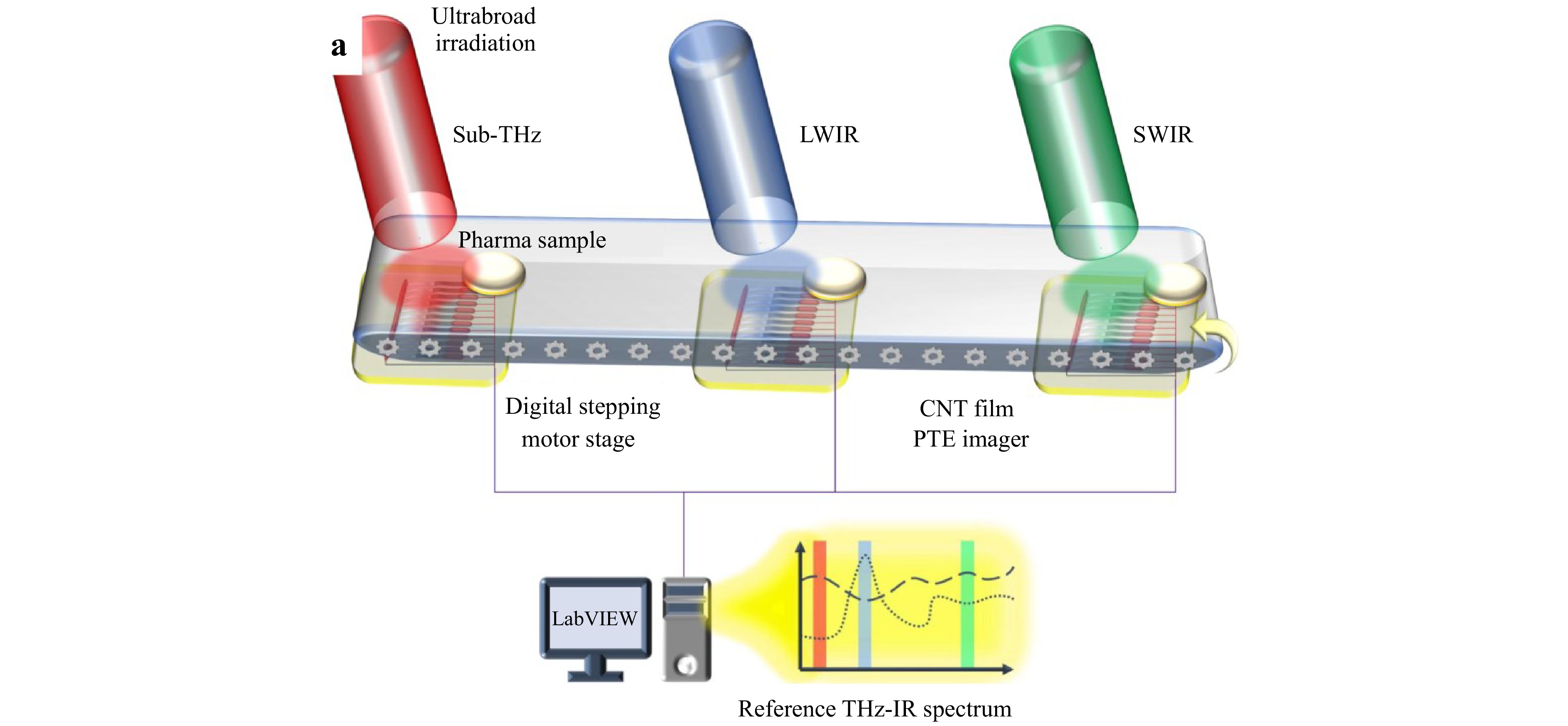 In a recent study published in Light: Science & Applications, Li et al16. from the Department of Electrical, Electronic, and Communication Engineering, Faculty of Science and Engineering, Chuo University, demonstrated a CNT thin-film array-based PTE imager fabricated via inkjet printing capable of photodetection across multiple light sources and broad spectral bands (Fig. 1). Utilizing the CNT film PTE imager within a transmission optical system under external broadband sub-terahertz to infrared (4.33−909 μm wavelength range) irradiation, non-destructive in-line dynamic pharmaceutical monitoring was achieved at a maximum scanning speed of 3 mm·s−1. Furthermore, combined with a hybrid system incorporating reflective scanning, the approach provided detailed surface state information of metallic impurities concealed within pharmaceutical pills. In future work, by optimizing the readout circuitry of the carbon nanotube thin-film PTE imager, the theoretically estimated operating speed could reach 270 mm·s−1, which is expected to promote its practical application in real-world scenarios (> 200 mm·s−1).