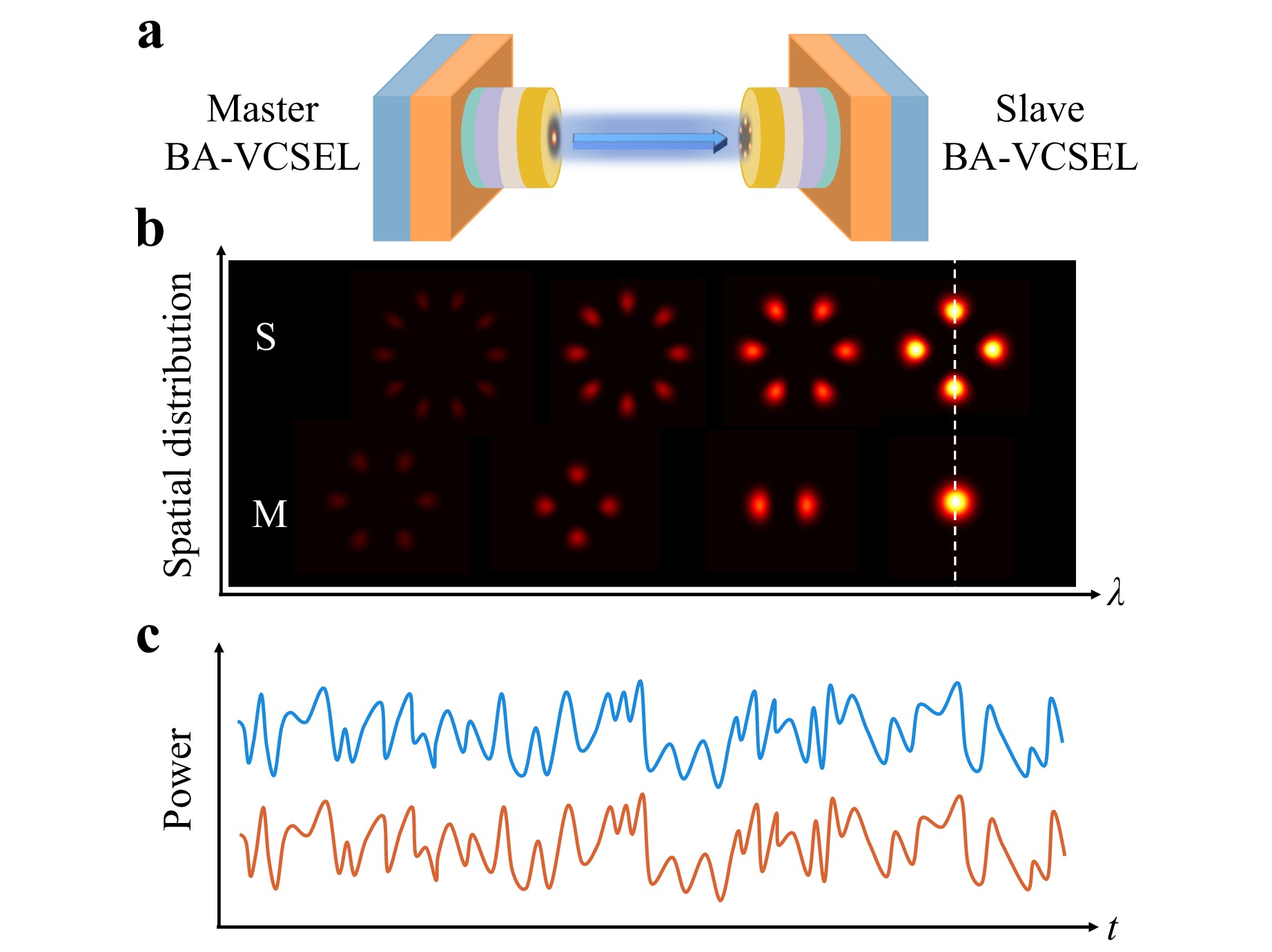 Fig. 1 Spatiotemporal chaos synchronisation of BA-VCSELs in master-slave configuration, achieved as spectral alignment between the dominant transverse modes.